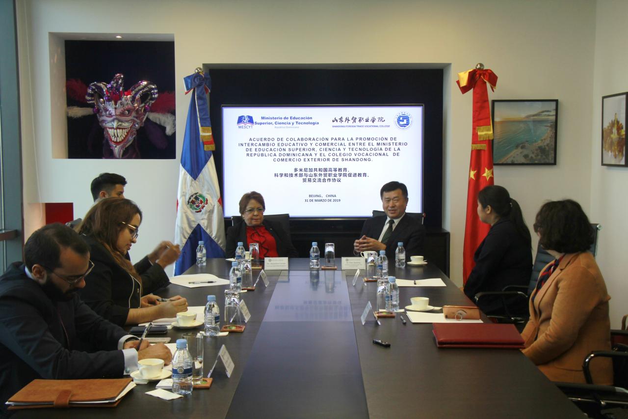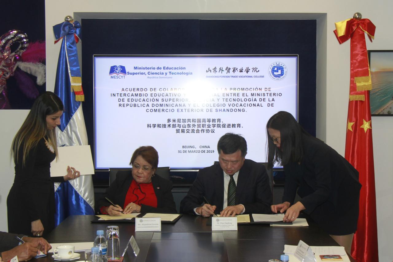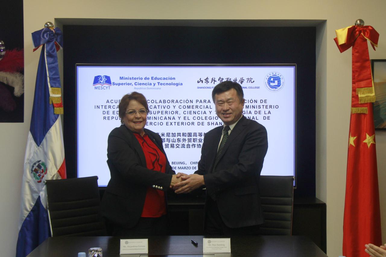 3月31日17时,伟德国际victor1946官网与多米尼加共和国高等教育、科学和技术部(MESSYT)合作签约仪式在多米尼加共和国驻中国大使馆举行。多米尼加共和国高等教育、科学和技术部部长Alejandrina German Mejia与伟德院长刁建东分别代表双方签署《多米尼加共和国高等教育、科学和技术部与伟德国际victor1946官网促进教育、贸易交流合作协议》,这是中多两国建交后,多米尼加共和国在中国签署的第一个教育、文化、科学技术和贸易领域的合作协议。