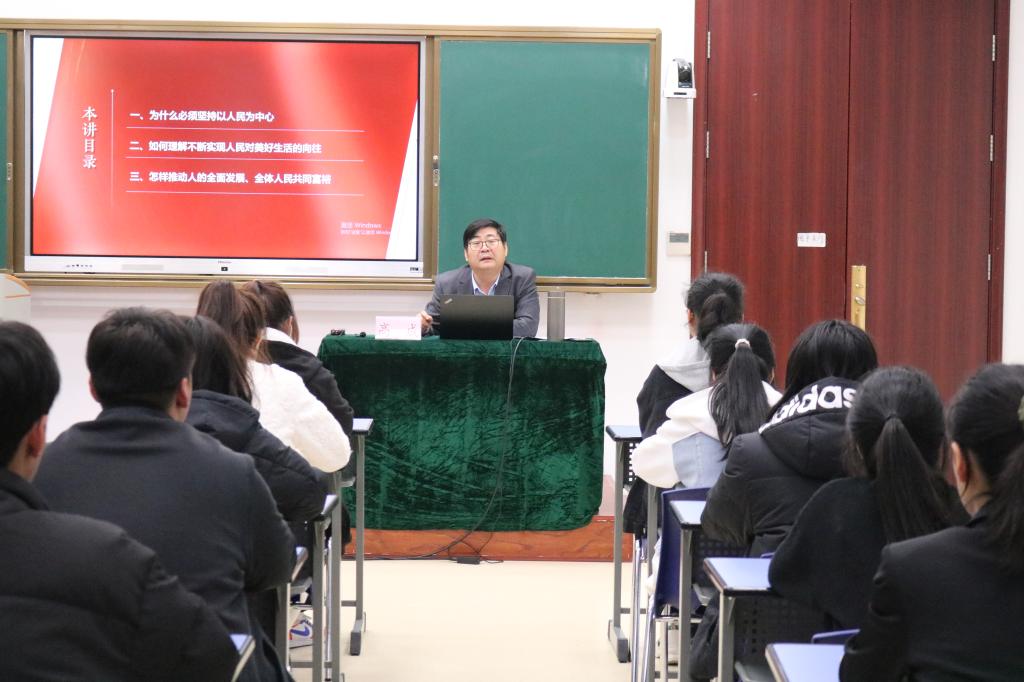 副院长高成以党的二十大对新时代中国共产党“坚持人民至上”人民观的新境界为切入点,结合新时代伟大成就、百年变局和世纪疫情挑战等实例,为泰安新校区新生讲解了“为什么坚持以人民为中心、如何发展全过程人民民主、怎样推进共同富裕”等三方面内容,教育引导同学们要坚定不移听党话、跟党走,以党的二十大精神和习近平新时代中国特色社会主义思想为指引,脚踏实地,努力学习,争做有理想的时代弄潮儿,让青春在全面建设社会主义现代化国家的火热实践中绽放绚丽之花。