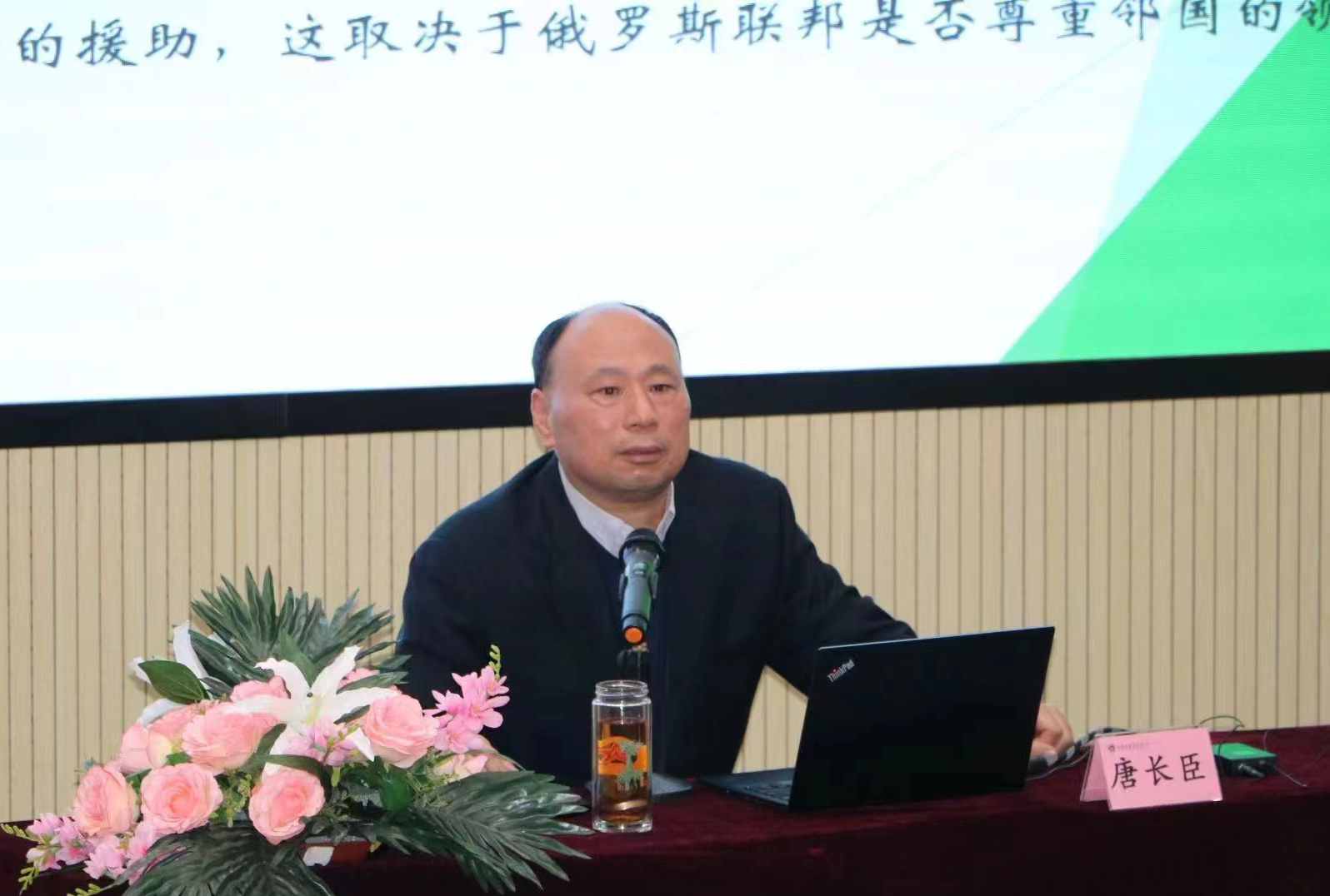 纪委书记唐长臣以习近平总书记在党的二十大报告中关于“促进世界和平与发展,推动构建人类命运共同体”为核心,以“俄乌冲突给我们的启示”为主题,围绕“俄乌冲突”这一热点话题,从冲突爆发前、爆发后、持续到目前的情况及俄乌冲突对我们的启示等四个方面进行了详细讲解,深入阐释了俄乌冲突对国际关系格局、地缘政治和对中国“一带一路”倡议实施的影响,引导青年学生站在世界格局的层面上看问题,更加珍惜现在来之不易的和平环境、发展环境。他勉励大家坚定理想信念,厚植家国情怀,提升国际化视野,不断增长自己的本领和才干,认真学好专业知识,弘扬和平、发展、公平、正义、民主、自由的全人类共同价值,为中华民族伟大复兴贡献青春力量。