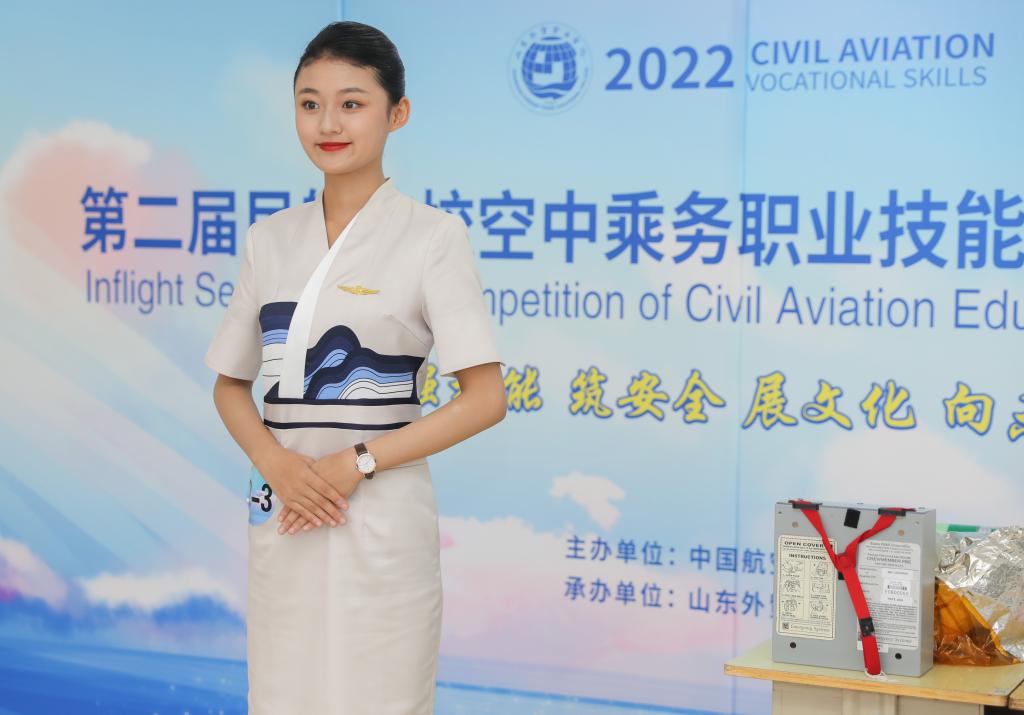 东方航空山东分公司地服部原党委书记、资深乘务长鹿佳在闭幕式上对比赛进行了点评和总结,她指出,各参赛队伍都发挥出了较高的水平,展示了专业教学成果,达到了竞赛目的,希望各参赛院校以本次大赛为契机,加强交流合作,全面深化空中乘务专业教育教学改革,提升专业核心竞争力,共同探索空中乘务专业建设创新发展的路径,全面提升民航空中乘务人才培养水平,展现“最美空服人”风采,助力中国民用航空事业稳步发展。