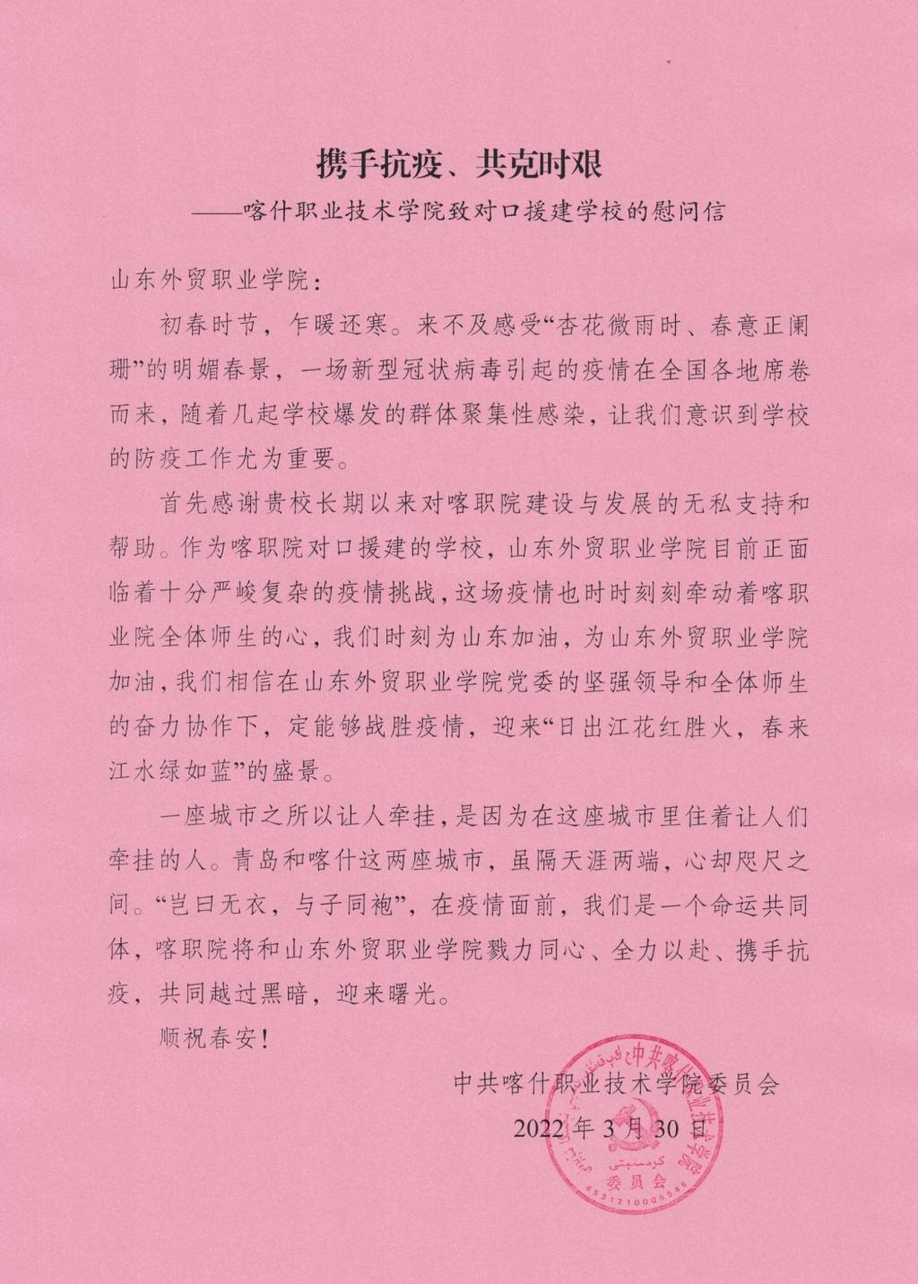 近日,伟德对口援建学校喀什职业技术学院给伟德发来《携手抗疫、共克时艰——喀什职业技术学院致对口援建学校的慰问信》,向伟德师生致以问候。