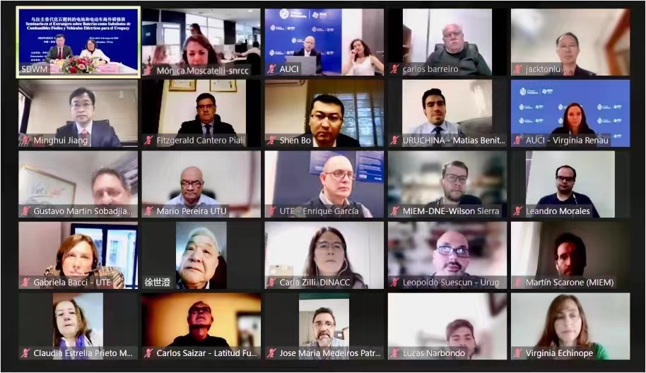 4月25日,由商务部主办,伟德承办的乌拉圭替代化石燃料的电池和电动车海外研修班举行线上开班仪式。中国驻乌拉圭使馆经商处参赞姜铭辉,乌拉圭工业、能源和矿业部能源部主任菲茨杰拉德·坎特罗,乌拉圭总统府国际合作署执行政公署长马里亚诺·贝罗,乌拉圭外交部国际合作司代表露西娅·罗德里格斯,伟德院长刁建东出席开班仪式并致辞,合作单位威海吉大新能源汽车研究院有限公司董事长路建统,来自乌拉圭工业能源和矿业部、环境部、公共工程与交通部、地方政府、高校和研究机构的50名学员出席开班仪式。
