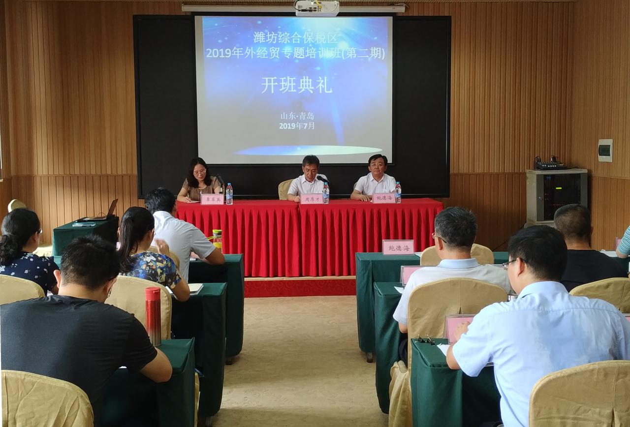 7月30日上午,潍坊综合保税区干部轮训第二期外经贸专题培训班在伟德黄岛基地开班。学院副院长周厚才、继续教育处处长覃翠英,潍坊综合保税区管委会三级调研员鲍德海出席开班仪式。仪式由覃翠英主持。周厚才和鲍德海在开班仪式上致辞。