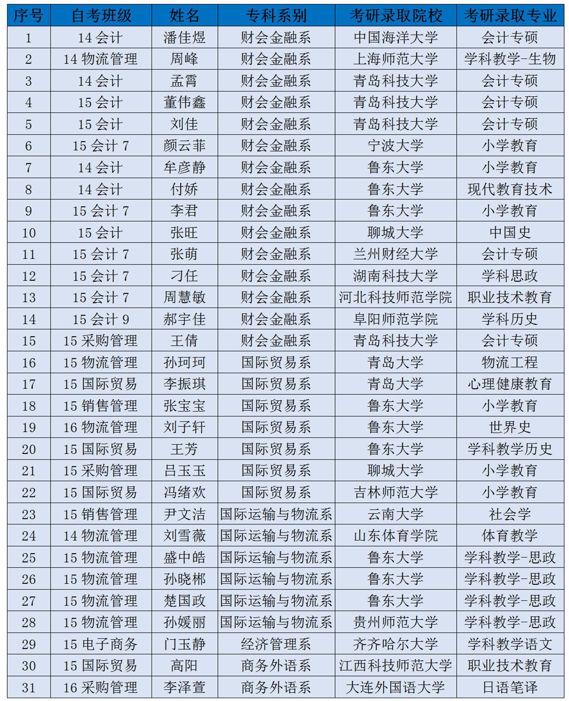 本年度考录的学校既有云南大学、大连外国语大学、湖南科技大学、上海师范大学、齐齐哈尔大学、宁波大学、兰州财经大学、江西科技师范大学、贵州师范大学等外省高等学府,也有青岛大学、青岛科技大学、聊城大学、鲁东大学等省内知名高校,考录专业共计17个。