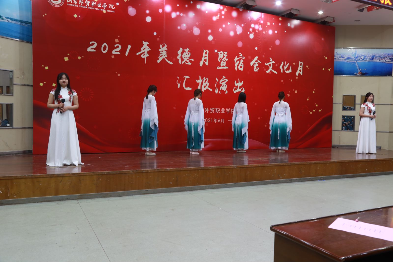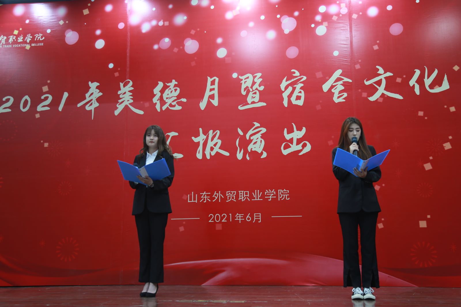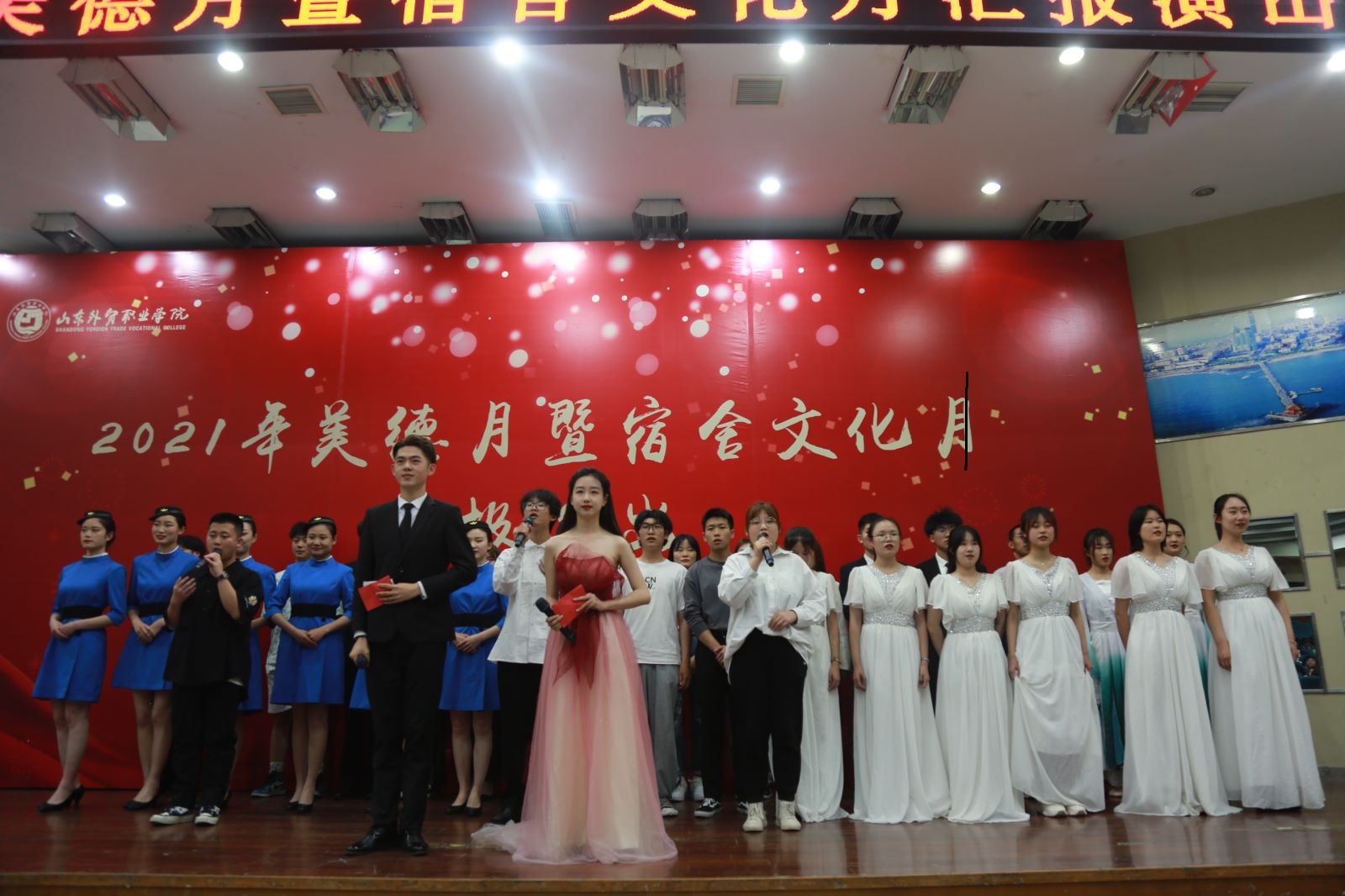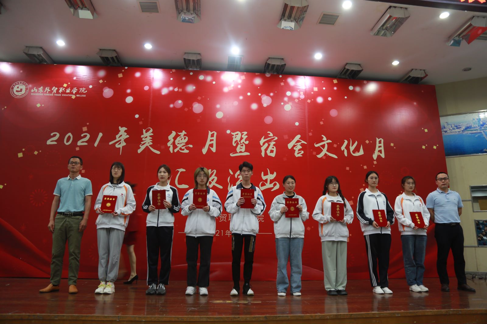 谷现海致辞,他回顾了美德月和宿舍文化月期间开展的丰富多彩的活动,阐释了美德月主题“立德修身,明智笃行”和宿舍文化节主题“以梦为马,寝刻韶华”的深刻内涵,高度赞扬了老师们的辛勤付出和同学们的热情参与。颁奖典礼与美德月节目汇报演出交插进行,大气磅礴的歌舞《灯火里的中国》拉开了汇出演出的帷幕。饱含深情的朗诵《我想成为这样的人》反映了同学们坚定地马克思主义信念。乐队倾情演唱《南方》和小品《等你回家》反映了新冠疫情期间全国人民同舟共济,共克时艰的中国精神。禁烟情景走秀《青春正好,烟草勿扰》独具匠心反映了美德月“禁烟专项活动”取得的成果。与会嘉宾在各节目间为2021年美德月和宿舍文化月各项比赛和活动的获奖同学颁发了证书。现场大屏幕现场播放了美德月和宿舍文化月期间各系开展所有主题活动视频短片,展现了外贸学子对中华民族传统美德理解、追求、演绎和收获。整场汇报会在《我的祖国》激扬的青春旋律中落下了帷幕。