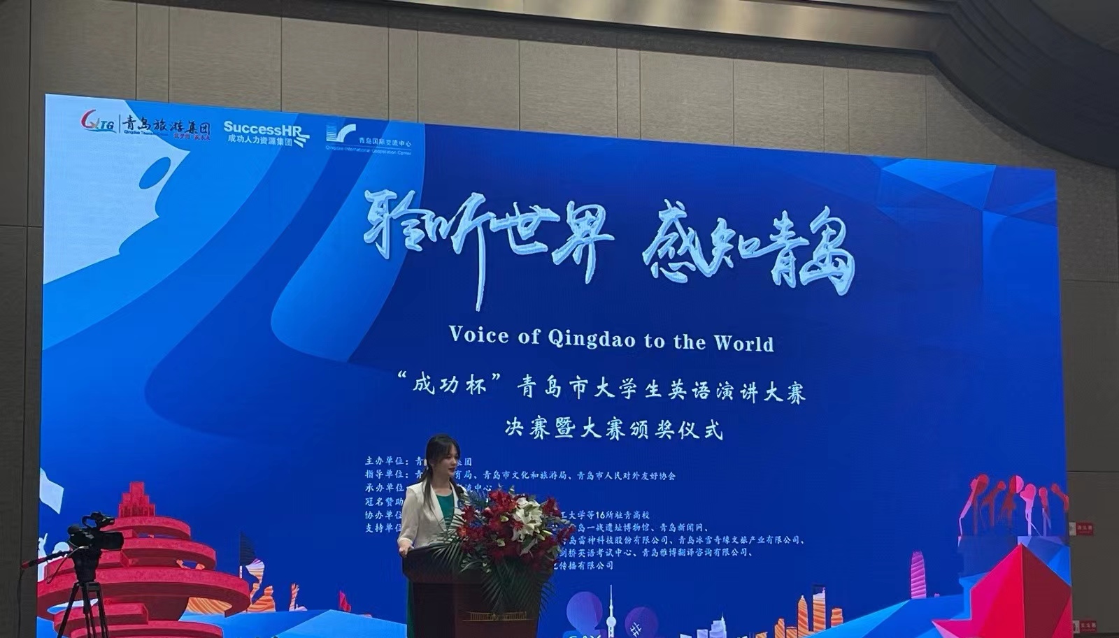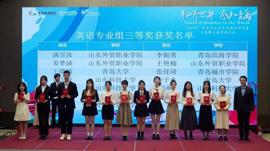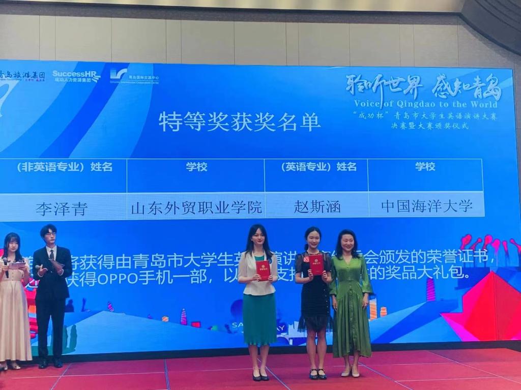 5月28日下午,首届“聆听世界 感知青岛”——“成功杯”青岛市大学生英语演讲大赛决赛暨颁奖仪式在青岛国际会议中心举行。经过激烈的角逐,伟德学生以优异的表现脱颖而出,国际物流与运输系学生李泽青以第一名的优异成绩荣获大赛非专业组特等奖,商务外语系学生满昱汝、姜梦涵和王艳楠荣获英语专业组三等奖。