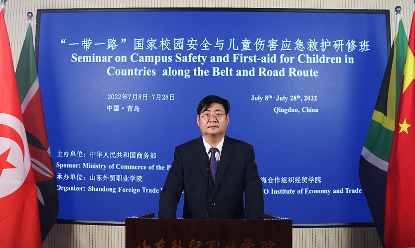 高成在致辞中简要介绍了山东省省情,并对学院的办学历史、校友资源、援外培训情况及本期研修班的安排进行了介绍。高成表示,培养在校师生校园安全与儿童伤害应急救护意识、增强其遭遇突发事件时应变能力、减少突发事件的伤害非常重要。山东省高度重视校园安全与儿童伤害应急救护工作,推出了切实有效的防范措施,构建了校园安全长效防范机制。学院将充分利用国内高校的师资和平台资源,与学员分享中国校园安全与儿童伤害应急救护经验,进而为我省与“一带一路”国家在教育、经贸等领域的合作搭建平台。