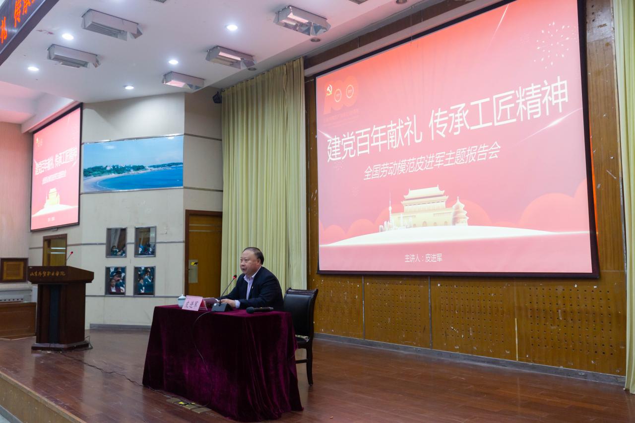 4月22日下午,学院在学术报告厅举行“建党百年献礼 传承工匠精神”全国劳动模范皮进军主题报告会,邀请了全国劳动模范、党的十八大、十九大代表,青岛港集团大港公司装卸队党支部副书记、副队长皮进军主讲。学院党委书记林凌家,商务外语系党政领导以及师生代表400余人现场聆听了此次报告,泰安新校区领导、师生代表通过网络直播观看了报告会,报告会由商务外语系党总支书记刘永美主持。
