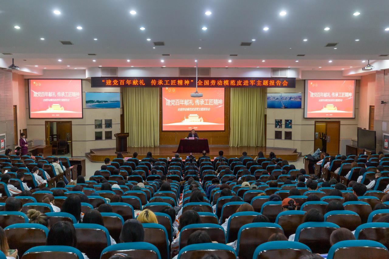报告会上,皮进军结合自身成长经历,讲述了自己从地地道道的农民工到新时期的产业工人的成长历程,从进入青岛港工作的那天起,皮进军任劳任怨,甘于奉献,勇于奋斗,敢于创新,带领装卸队员潜心研究装卸工艺,解决装卸中的难题,提高装卸效率,创造了66项绝活,先后4次刷新纸浆接卸船世界纪录,创造了5个以自己名字命名的港口作业技能品牌,成为青岛港区的一面旗帜。皮进军结合青岛港的发展变化与自身学习感悟及工作经历,分享了其作为十九大代表,参加党的十九大的所见所闻,以产业工人的视角从强国建设、智能制造、为人民谋福祉、对外开放、当好新时代党员先锋五个方面深刻阐述了党的十九大以来我们国家在经济建设、社会发展取得一系列成就。最后,皮进军寄语同学们,要坚定理想信念,深刻理解把握时代潮流和国家需要,脚踏实地、埋头苦干,甘于奉献,勇于创新,奋勇投身新时代、接力建功中国梦,在为人民利益的不懈奋斗中书写人生华章!