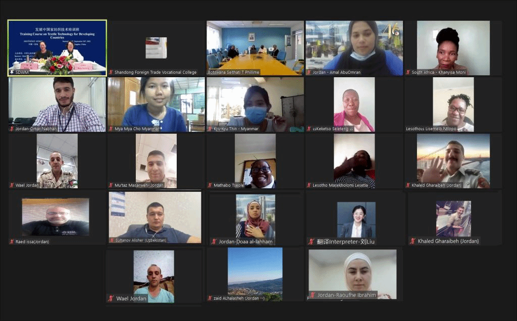 该研修班为期21天,共有来自博茨瓦纳、莱索托、卢旺达、南非、缅甸、约旦、乌兹别克斯坦和阿富汗的45名学员参加,所有课程均由相关领域具有高水平理论知识和实践经验的资深专家进行授课。除伟德师资外,还邀请了青岛大学纺织服装学院、青岛宏大纺织机械有限责任公司等单位纺织技术和设备维护领域的专家学者参与授课。学员线上参观考察了青岛第六印染厂及德州恒丰集团,就纺织品印染加工、产品质量和性能检测、机械设备使用及保养等问题与授课老师展开热烈讨论。