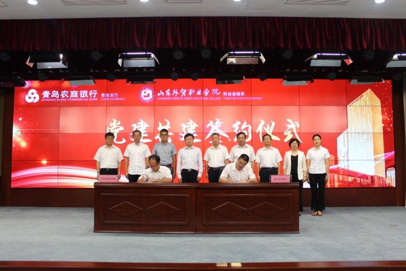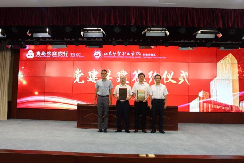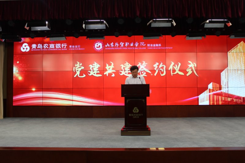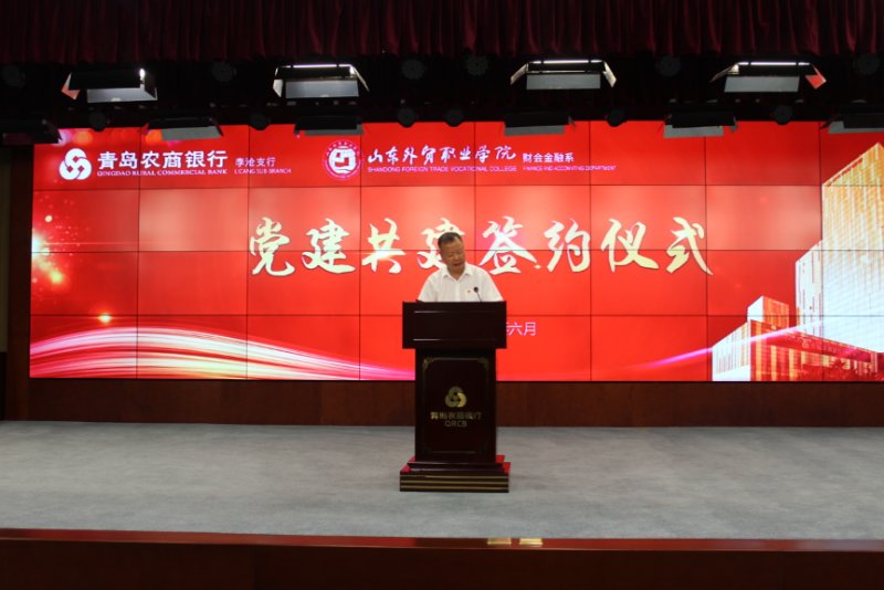 财会金融系党总支与青岛农商银行李沧支行签订了党建共建协议,并互设“扬帆先锋”党员实践基地和“金融思政”党员教育基地,财会金融系党总支教工一支部与青岛农商银行李沧支行第四党支部结成共建支部。刘宗波行长与刁建东院长分别致辞。