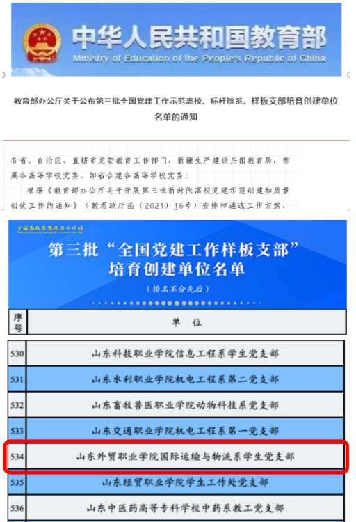 近日,教育部公布了第三批全国党建工作示范高校、标杆院系、样板支部培育创建单位名单,伟德国际运输与物流系学生党支部成功入选“全国党建工作样板支部”培育创建名单。