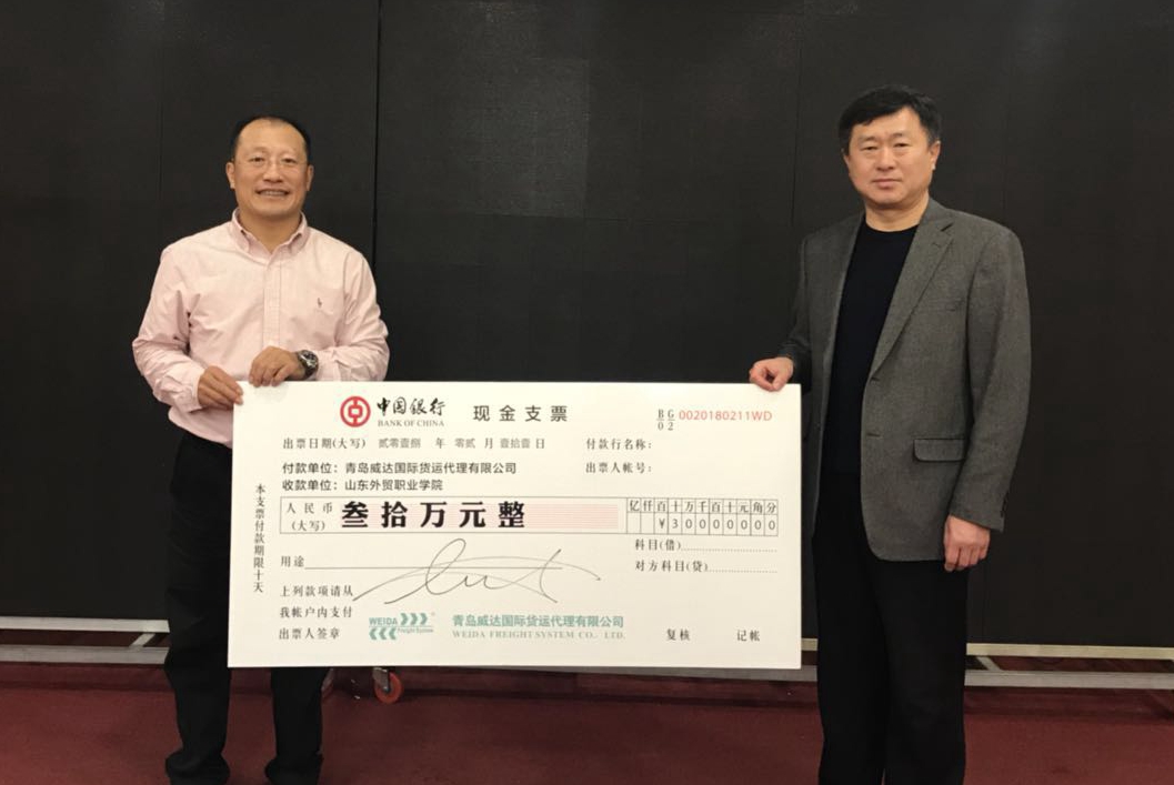 日前,校友企业青岛威达国际货运代理有限公司举行公司成立20周年年会。院长刁建东作为该公司董事长、伟德93届国际贸易专业毕业校友魏永良当年的班主任受邀参加,并代表学院接受了公司捐赠的30万元人民币资金。