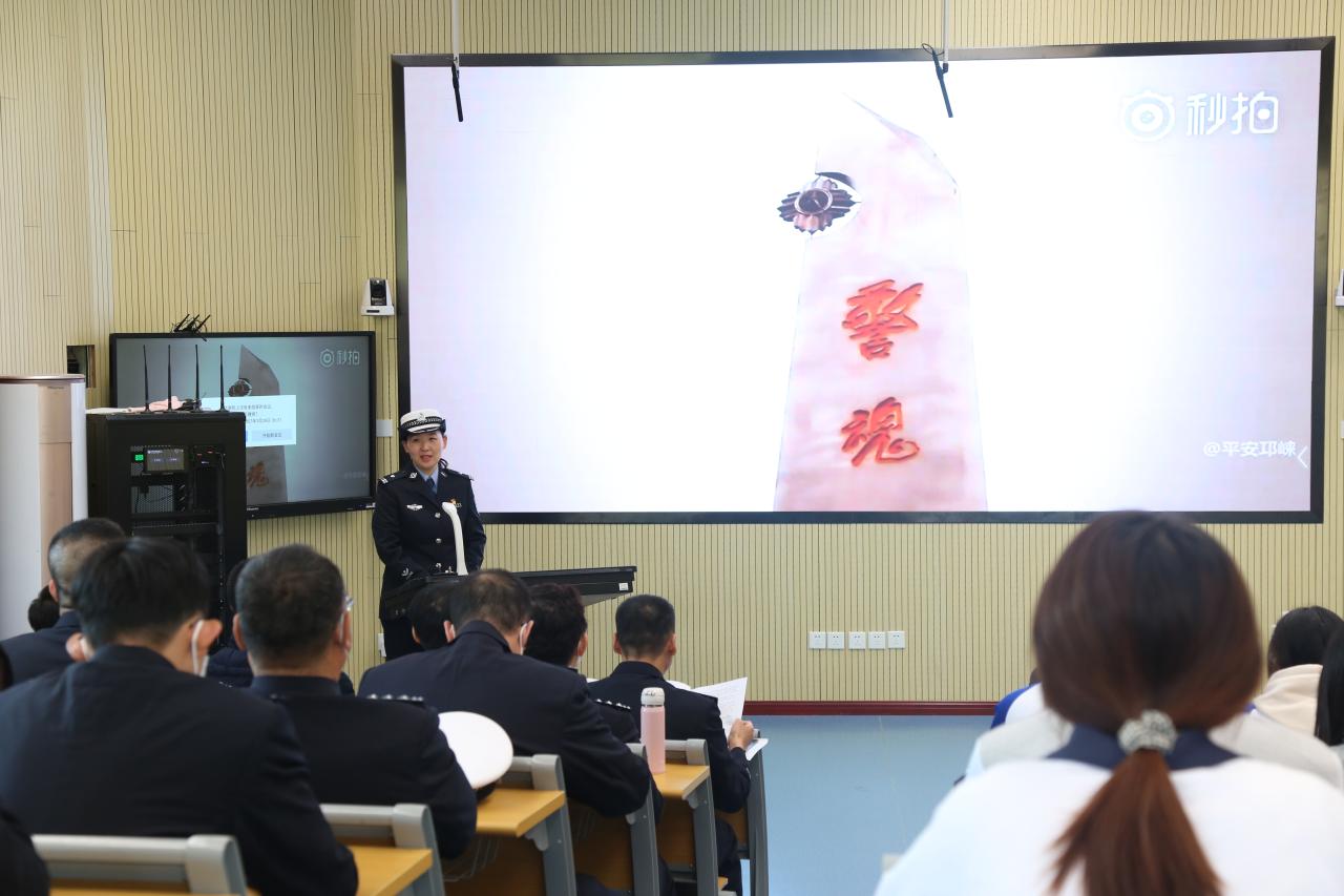 随后活动以李涌同志的先进事迹宣讲拉开帷幕,通过英模事迹宣传片《李涌,闪亮的“路标”》和大队民警、辅警同志的宣讲还原了李涌同志生前的先进事迹和牺牲的过程,在场的同学无不为之动容。