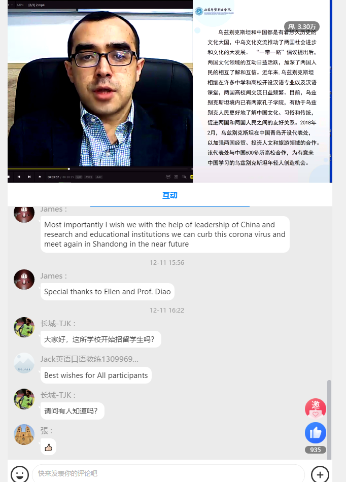 本次国际研讨会的主题是“互学互鉴,创新职业教育校企合作模式”。教育部职业技术教育中心研究所科研领导小组副组长邓泽民对中国职业教育校企合作的发展历程和国家政策进行了梳理、解读。乌兹别克斯坦电子商务协会顾问伊尔霍姆·阿里夫贾诺夫介绍了乌兹别克斯坦电商产业的发展现状以及中乌在电子商务产业的合作机遇。海尔集团电器产业有限公司总经理冯国民分享了海尔的人才经营理念、人才创新体系和人才贡献成果。巴基斯坦乔里斯坦动植物科学大学寄生虫学系助理教授和外联办主任贾马尔·穆罕默德·汗探讨了中巴职业教育交流合作的现状与展望。院长刁建东分享了伟德开展跨境电商人才培养和促进跨境电商产业发展方面取得的成效,提出了伟德围绕“一带一路”倡议、中国(山东)自由贸易试验区、中国-上合组织地方经贸合作示范区建设,持续深化产教融合、校企合作,构建外经贸“产学研创用”命运共同体的构想。