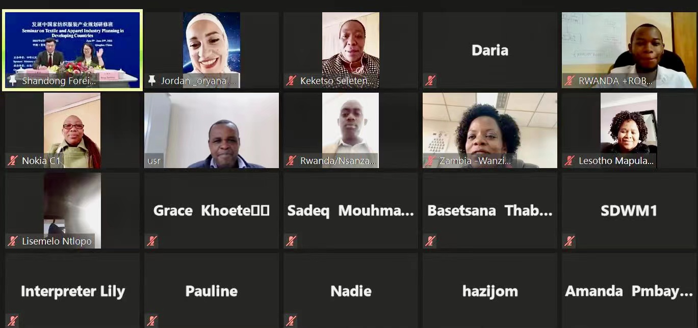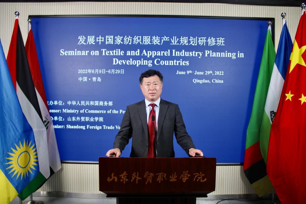 刁建东在致辞中概述了山东省纺织服装产业的发展情况,并对学院的办学历史、校友资源、援外培训情况及本期培训班的安排进行了介绍。他表示,纺织服装产业是山东省的传统优势产业、重要支柱产业和民生产业。中国纺织十强企业,山东占据5位,目前已有不少在境外建立分支机构、投资建厂。学院将充分利用国内高校的师资和平台资源,与学员分享我国纺织服装产业规划的发展经验,为我省与卢旺达、约旦、莱索托、伊拉克和赞比亚在教育、经贸、轻工业等领域的合作搭建平台。