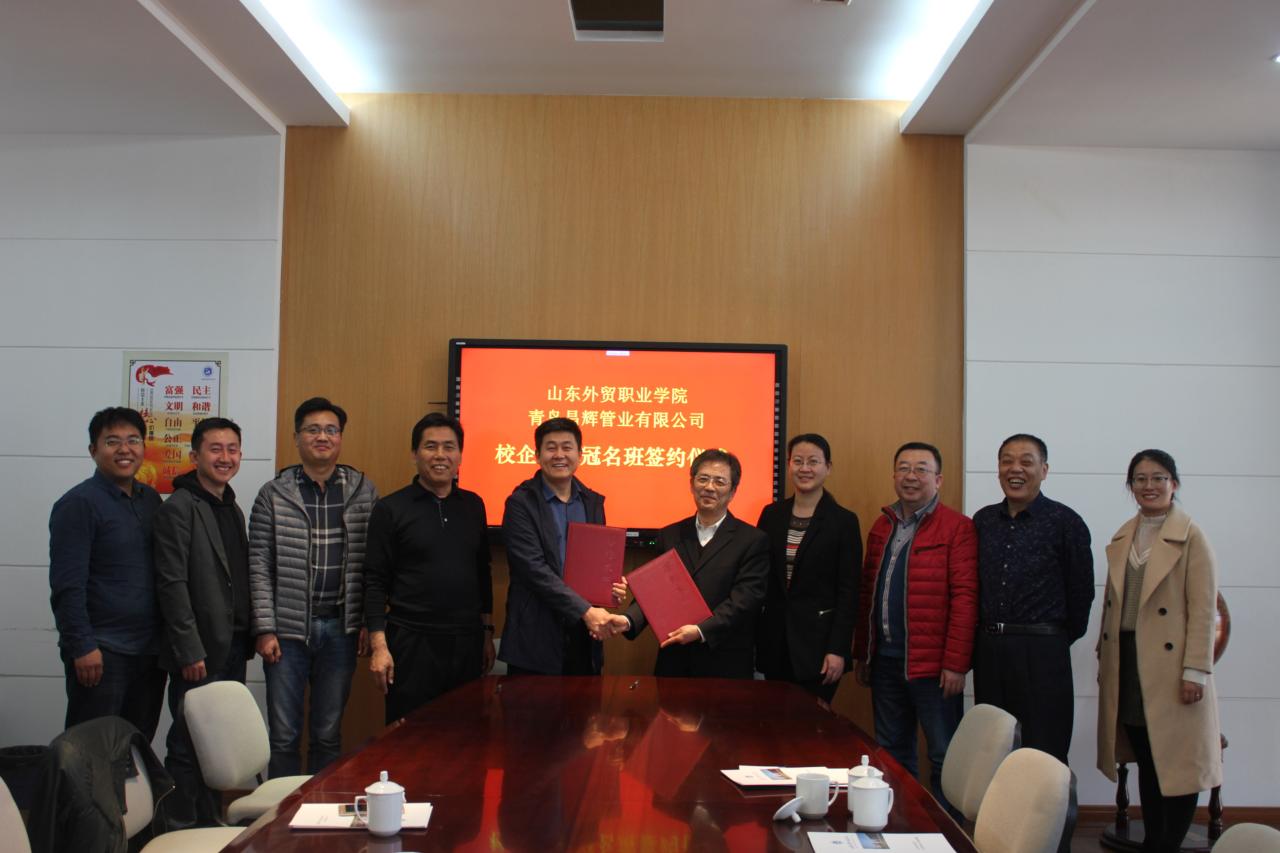 3月15日下午,学院与青岛昌辉管业有限公司校企合作冠名班签约仪式在学院图书馆三楼会议室举行。青岛昌辉管业有限公司董事长刘玉昌、总经理张多斌、副总经理杨大明;学院副院长周厚才,校友办公室主任陈延宁,校企合作办公室副主任陈磊,国际贸易系书记苏春鹏、主任刘珉、副主任李飞、冠名班辅导员李筱康参加了签约仪式。