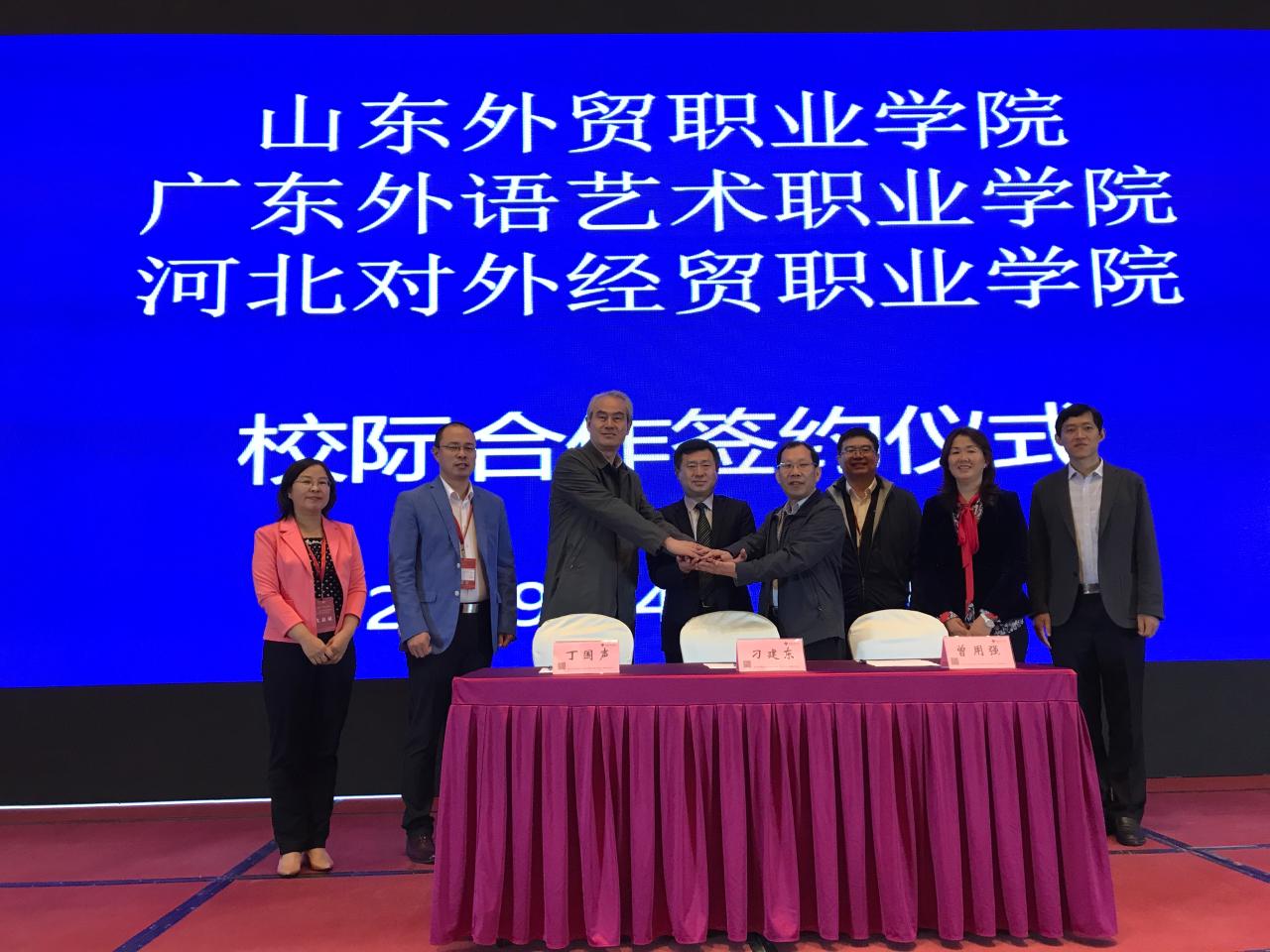 论坛举办期间,刁建东代表学院与河北对外经贸职业学院院长丁国声、广东外语艺术职业学院院长曾用强签署了《国内交换生项目框架协议》。三所院校将根据专业人才培养方案,互派学生到相同、相近专业学习,充分发挥优势资源,共同探索职业院校协同育人机制,打造全方位多渠道协同育人环境。
