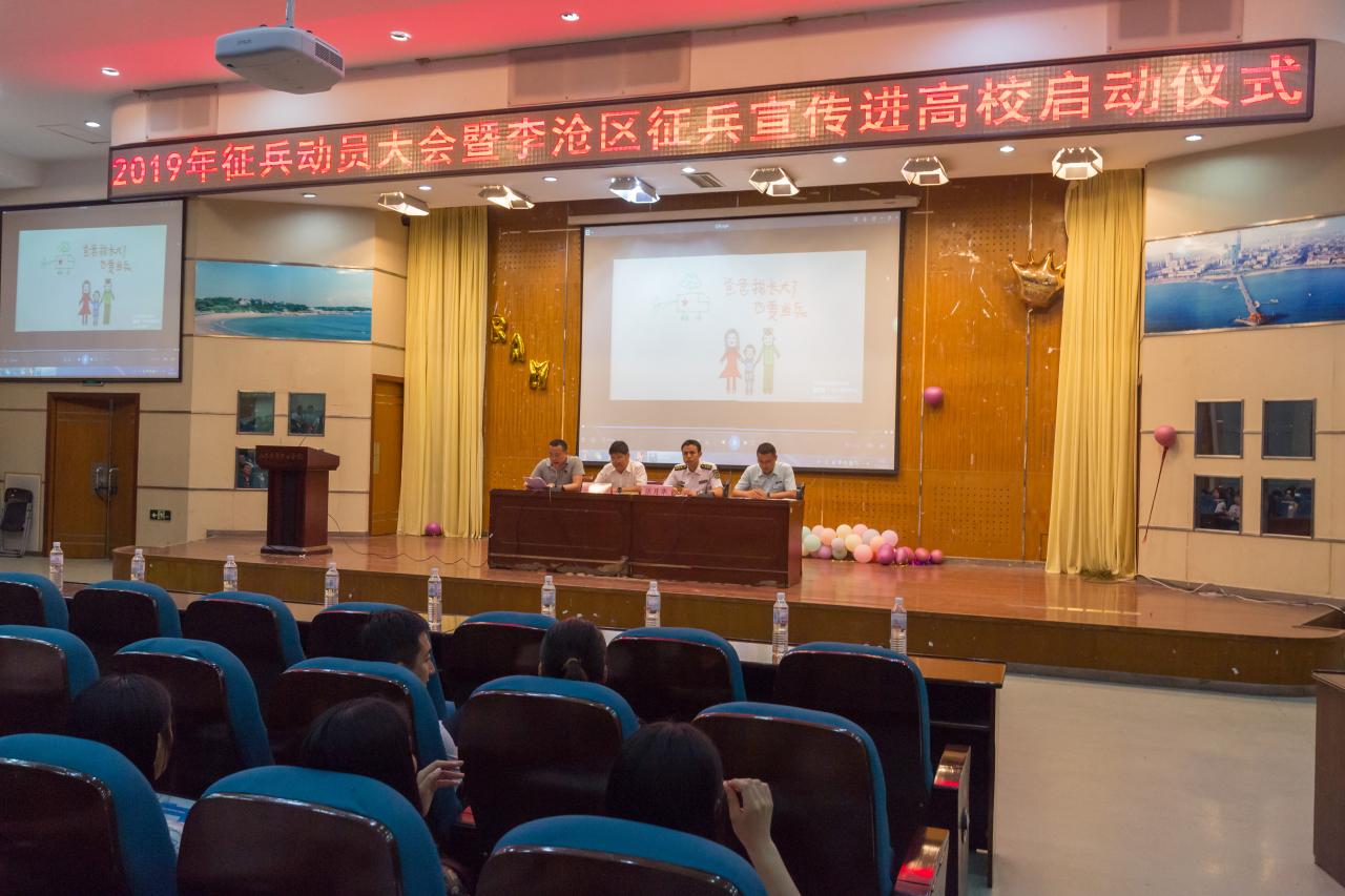 6月18日,学院在图书馆学术报告厅举行2019年征兵动员大会暨李沧区征兵宣传进高校启动仪式。李沧区人武部部长张月华、保障科参谋周玉伟,学院副院长高成、学生工作部(处)、各系相关负责人、辅导员及学生代表400余人参加会议。会议由学生工作处副处长梁政委主持。