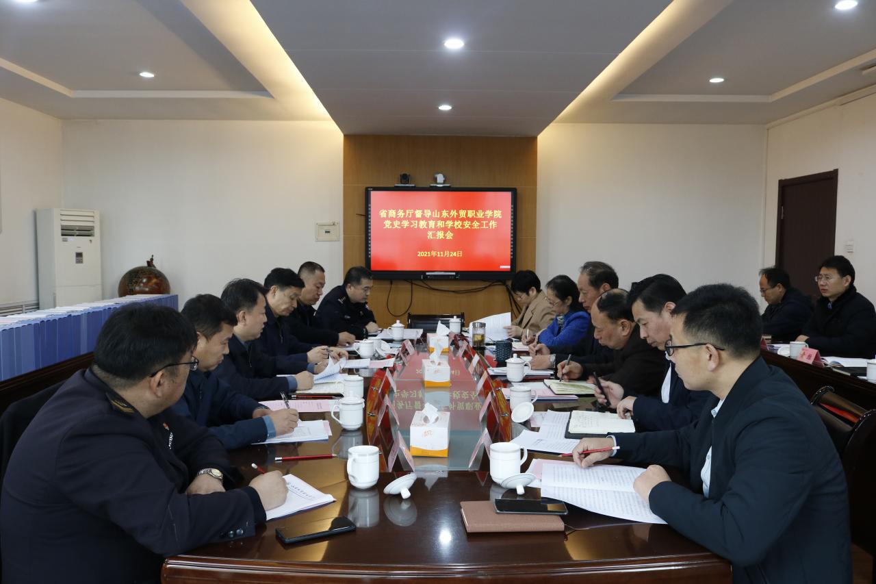 省商务厅驻青业务联络办公室主任姜宝臣,省商务厅办公室副主任、二级调研员赵松壁,省商务厅办公室四级调研员袁春,青岛市李沧区国保大队大队长王高鹏,青岛市李沧区市场监督管理局餐饮服务监管科科长高大勇,学院党委书记林凌家,纪委书记唐长臣,副院长程巍,办公室、组织人事处、宣传统战部、纪委、学生工作处(安保办)、后勤服务处等部门负责人,国际贸易系、财会金融系党总支书记参加了会议。