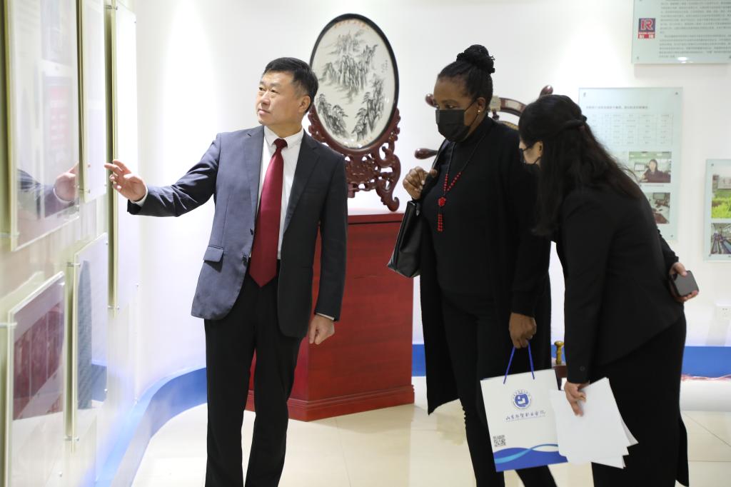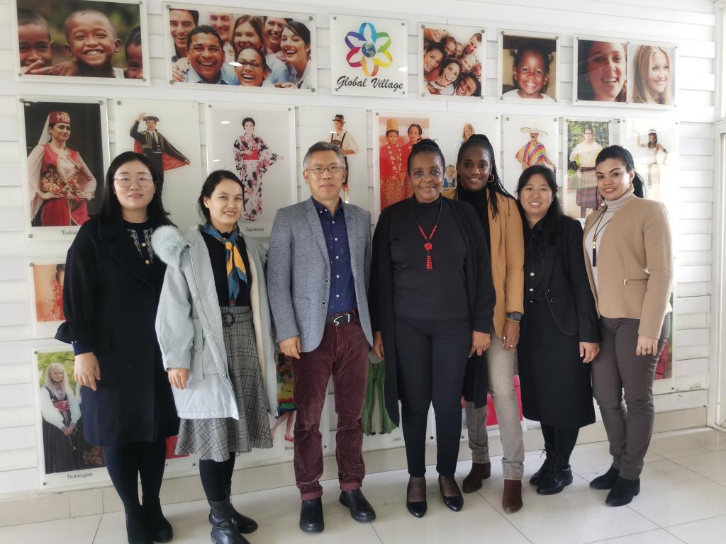 会谈后,刁建东向莉迪亚详细介绍了学院校友风采展,以及学院多年来形成的“招生-人才培养-就业”良性生态环。应用西语专业教师陪同客人参观了学院综合性语言文化实践教学基地——外语村。