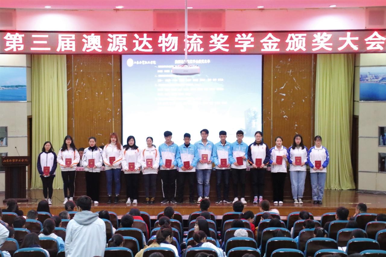 12月4日中午,学院在学术报告厅举行第三届澳源达奖学金颁奖大会。山东澳源达物流有限公司总经理朱科、副总经理巴江涛,学院副院长高成、学生工作处负责人、各系党总支书记、辅导员代表和学生代表400余人参加颁奖大会。