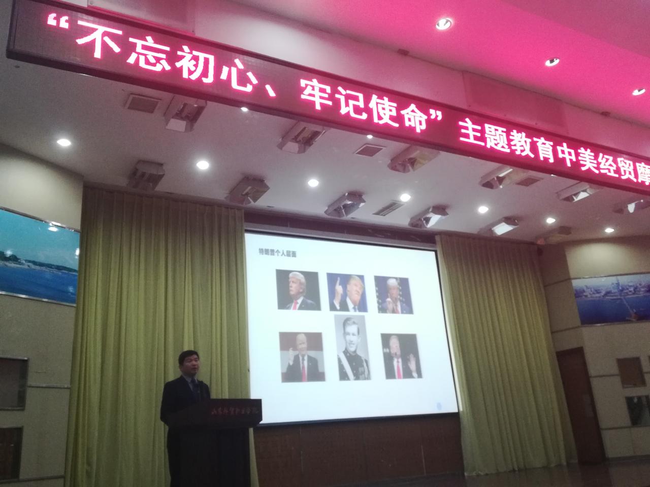 10月18日下午,国际运输与物流系主任刘希全为全体党员作“不忘初心、牢记使命”主题教育“中美经贸摩擦解读”专题讲座,学院党委书记林凌家出席,青岛校区全体党员参加。