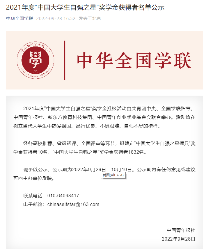 据悉,2021年度“中国大学生自强之星”奖学金推报活动由共青团中央、全国学联指导,中国青年报社、新东方教育科技集团、中国青年创业就业基金会联合举办,旨在树立当代大学生中热爱祖国、品行优良、不畏艰难、自强不息的榜样。近年来,学院高度重视在青年学生中培育和践行社会主义核心价值观,将思想政治引领贯穿立德树人全过程,深入挖掘身边的先进典型,扎实做好“大学生自强之星”等青年典型的培育和评选工作,突出示范效应,用榜样的力量和模范表率,引导同学们自强不息、砥砺前行。
