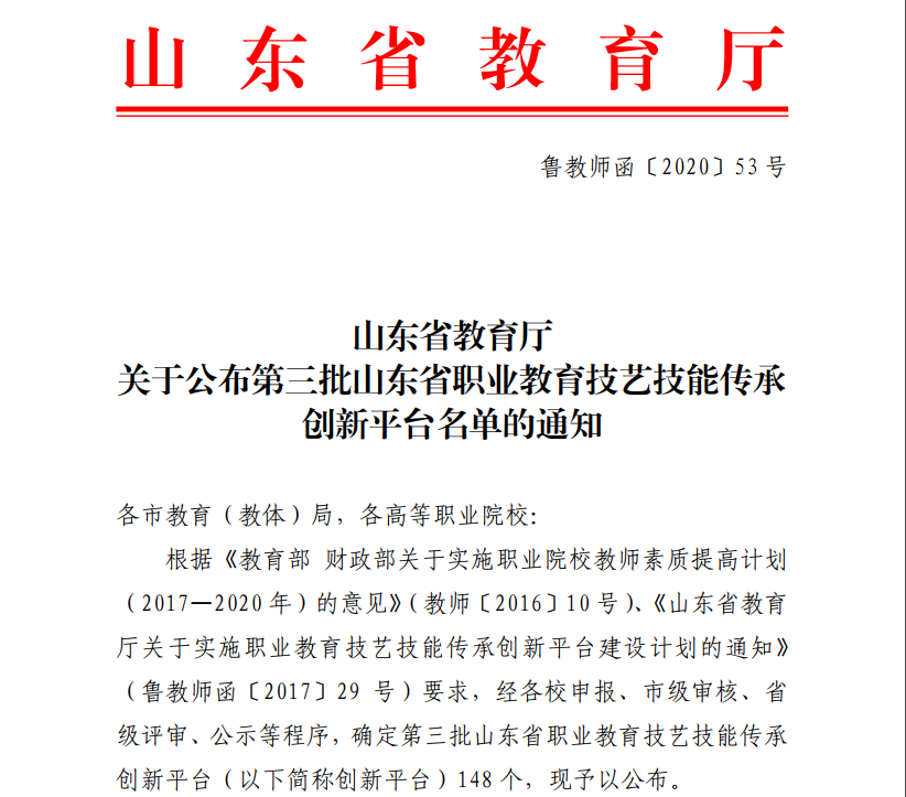 山东省职业教育技艺技能传承创新平台项目属省级标志性成果。平台建设期为三年,山东省教育厅结合中央财政职业教育教师素质提升建设项目资金,给予每个平台12万经费支持,重点用于平台成员培训和专题研修工作,要求平台在建设期完成传统(民族)技艺传承、实习实训资源开发、创新创业教育、协同研修与创新等建设任务。