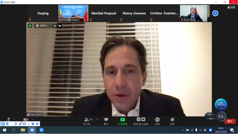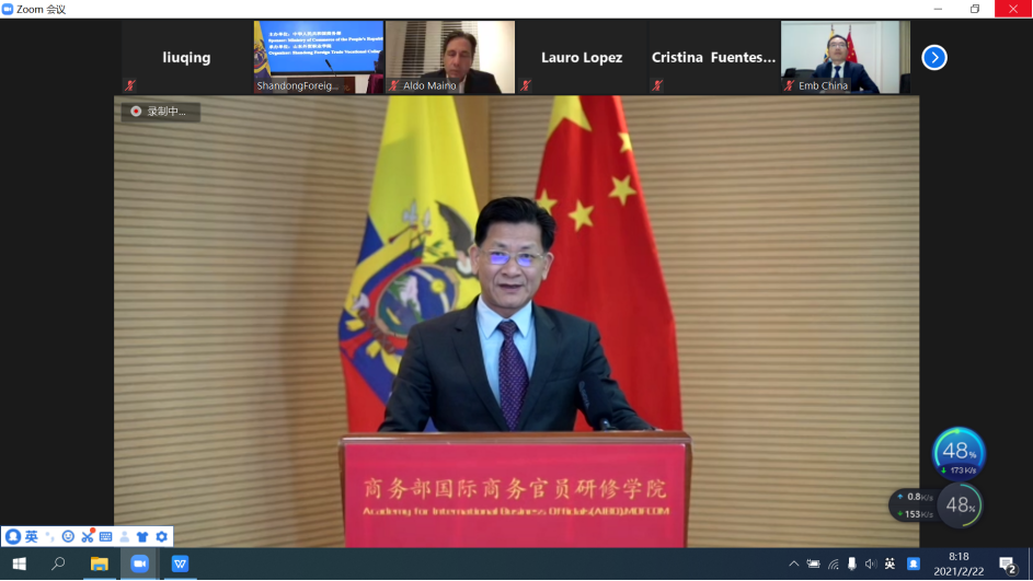 2月22日上午,伟德承办的“厄瓜多尔公共政策评估及公共服务研修班”在伟德李沧校区举行线上开班仪式,厄瓜多尔高等教育、科技和创新国务秘书处常务副国务秘书Aldo Alfredo Maino Isaías、商务部国际商务官员研修学院副院长陈润云、中国驻厄瓜多尔使馆商务参赞陈峰、山东省商务厅对外投资和经济合作处处长张国亮、伟德院长刁建东共同出席线上开班仪式并致辞。来自厄瓜多尔外交部的Melissa Stephanie Miranda Herrera女士代表全体学员发言,开班仪式由伟德国际官员研修学院院长王保红主持。