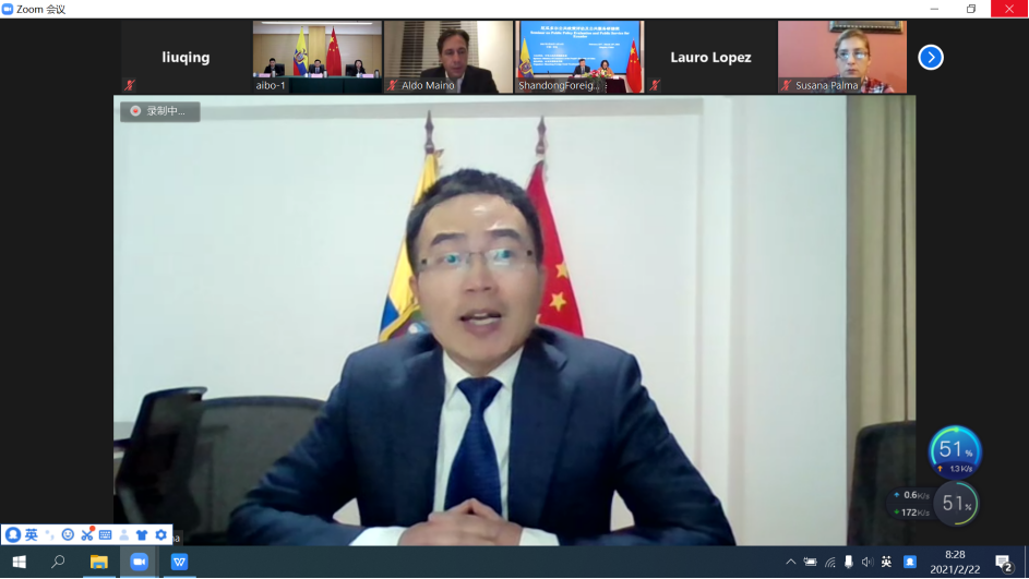 刁建东对参加此次研修班的学员表示欢迎,对中厄双方领导的重视和指导表示感谢,并介绍了学院的基本情况。刁建东指出,此次研修班将与学员分享中国公共政策评估及公共服务领域的发展历程、改革措施、经验教训和发展现状,包括中国的脱贫成就,为厄方公共事业发展提供借鉴,为山东与厄瓜多尔在经贸合作、对厄投资、教育和公共卫生等领域合作发挥桥梁作用。