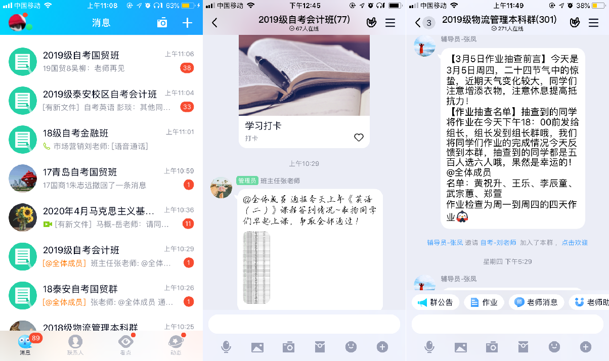 本次自考本科班线上教学,共涉及54位授课教师和31个班级的2039名学生,另有5个班级305名学生开展线上本科毕业论文写作指导。组织开展线上教学工作前,学院对全体学生开展了线上问卷调研,涉及对线上教学的意见建议和在线学习的困难等问题,对未提交问卷的同学进行逐一联系确认;与所有任课教师进行电话或微信沟通,根据不同的课程特点确定采用的授课方式,做好开课前的平台测试和内容准备;实行教务老师盯课制度,协助授课教师和学生解决课堂组织、考勤、作业测试等工作,取得了较高的学习满意度。