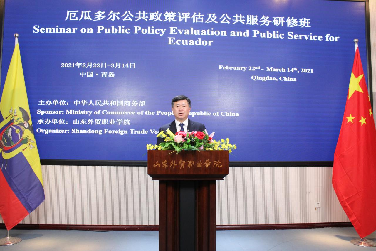 刁建东讲到,中国的各项公共事业发展迅速,在公共政策评估和公共服务建设方面有很多值得借鉴的经验,希望学员继续与专家保持沟通和联系,欢迎厄瓜多尔学员疫情过后来中国青岛实地考察。刁建东表示,本次研修班是双方友好交往的开始,希望通过各方的共同努力,促成中厄两国在贸易、公共服务、教育等领域达成更多的互利共赢的合作项目。