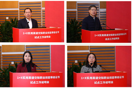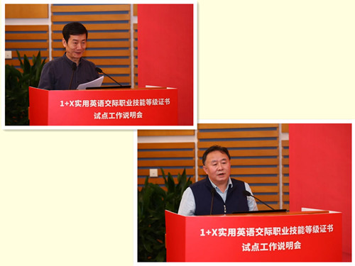 实用英语交际职业技能标准研发首席专家、外语教指委副主任委员、广东省外语艺术职业学院院长曾用强,江苏高职诊改委顾问戴勇,外语教指委委员、北京经济管理职业学院外国语学院院长王月会,北京教科院职业教育研究所教研员、中等职业学校英语课程标准研制组核心成员刘海霞,中国巨力集团副总裁刘冠军,中能昊龙控股集团常务副总裁杨子舟,外研在线VETS项目推广部主任王兰分别就1+X实用英语交际职业技能等级证书作主旨报告。