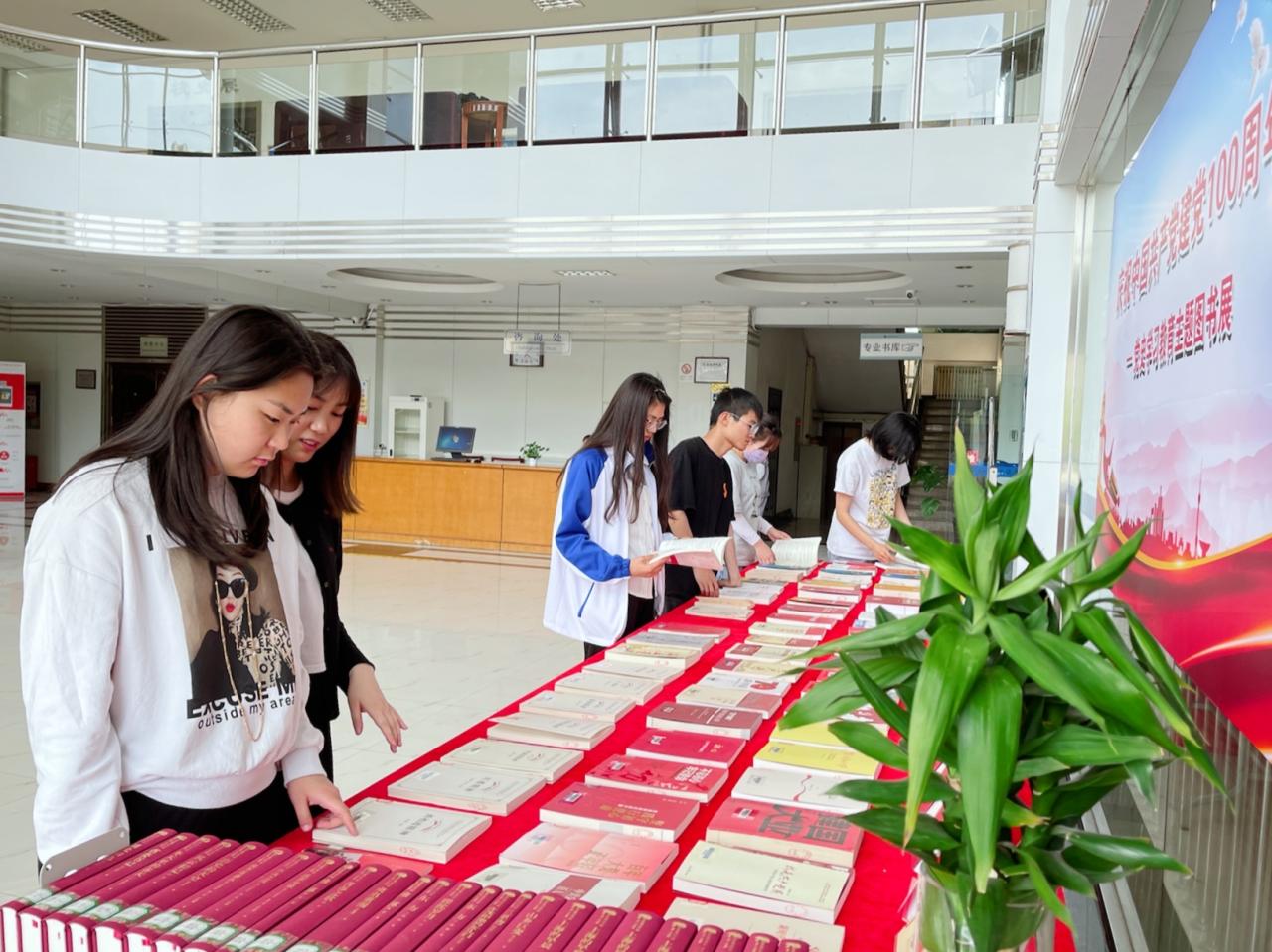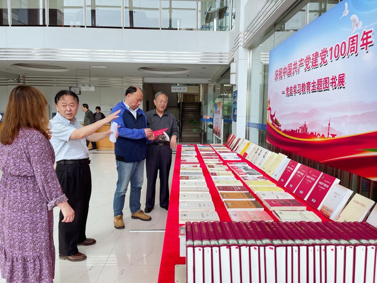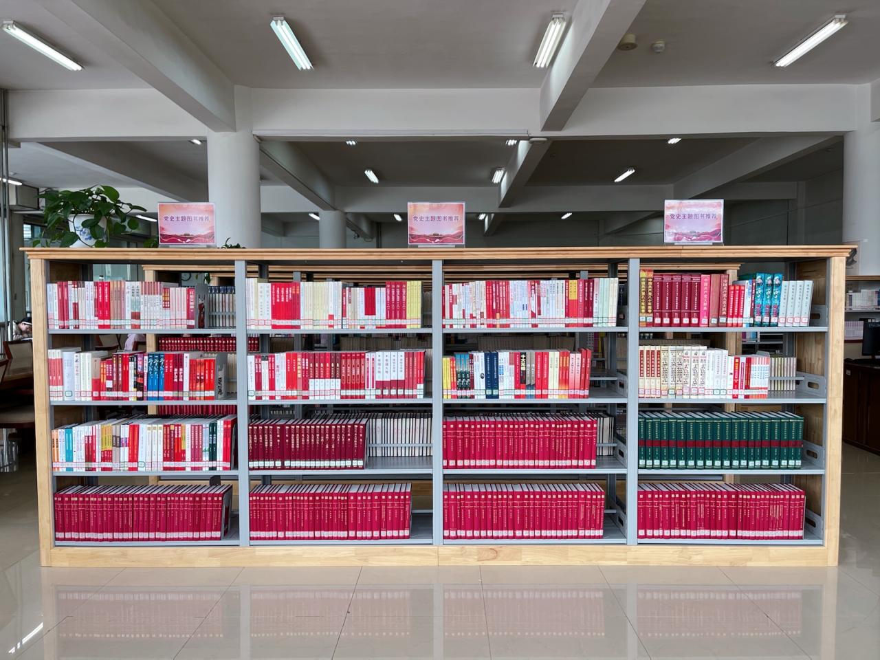 图书馆经过认真组织、精心筹划,通过购买、书库调拨等方式精选了党史主题图书115册,布置于一层展览区,展览的图书包括党史学习教育指定书目、中共党史人物传记、党史读物和红色经典书籍等,展览涵盖《中国共产党简史》、《习近平谈治国理政》、《习近平的七年知青岁月》、《初心一叶》、《火种:寻找中国复兴之路》、《苦难辉煌》、《红船精神》等著作,从不同角度展现了中国共产党的百年光辉历程及取得的辉煌成就,为广大读者深入学习党史提供了丰富的资料,主题图书展前吸引了众多读者驻足翻阅。此外,图书馆在社科三书库设立党史主题图书专架,展出两百余册党史主题书籍,方便师生读者借阅。