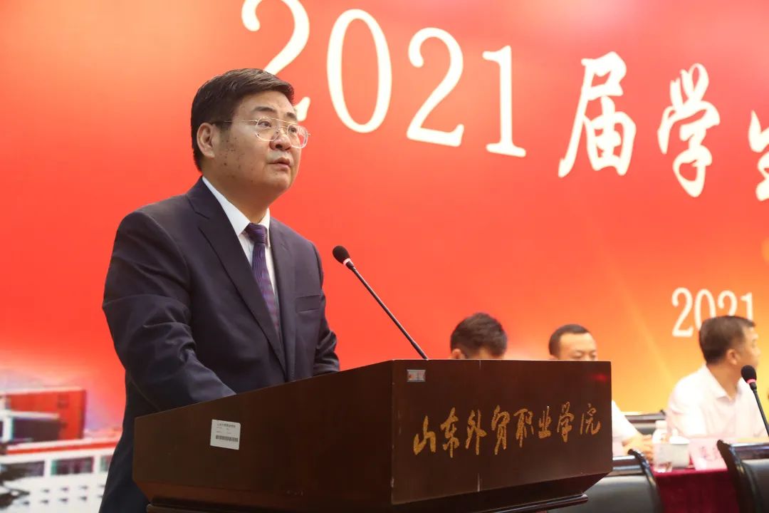 刁建东在致辞中代表学院全体师生员工向毕业生表示热烈祝贺,他深情回顾了毕业生在校期间的学习生活和学院过去三年的快速发展成就,总结、分享了优秀校友们的成功经验。他引用习近平总书记在庆祝中国共产党成立一百周年大会上讲话勉励学生:“未来属于青年,希望寄予青年。新时代的中国青年要以实现中华民族伟大复兴为己任,增强做中国人的志气、骨气、底气,不负时代,不负韶华,不负党和人民的殷切期望!”最后,他祝愿同学们负笈前行,一如既往;事业有成,学业进步,一帆风顺,前程似锦。