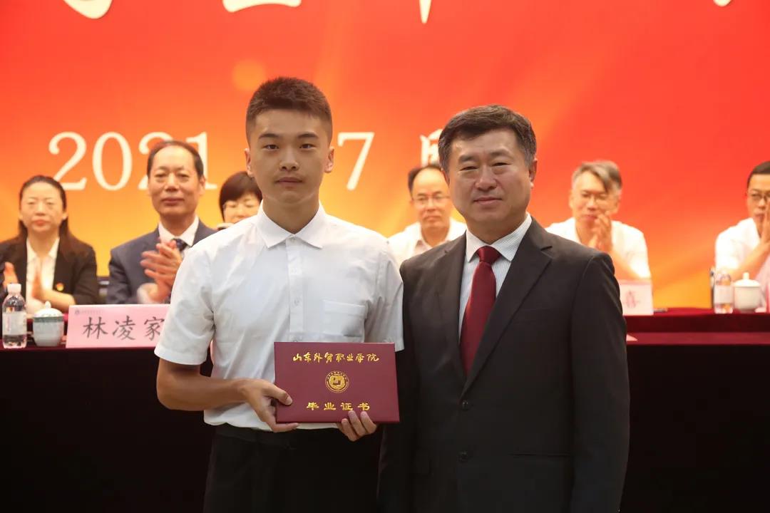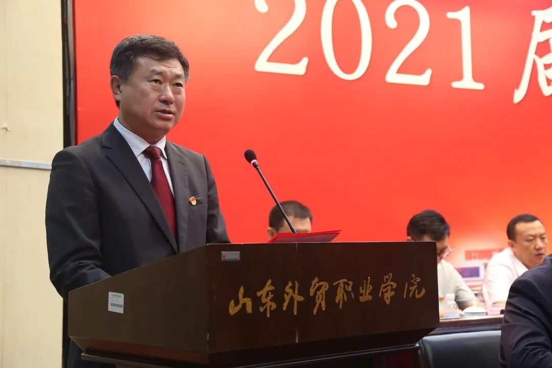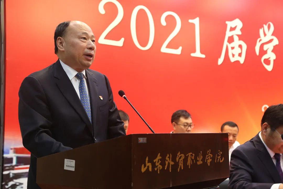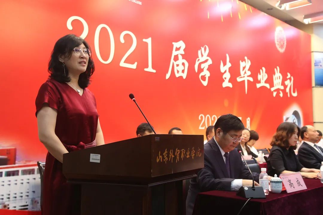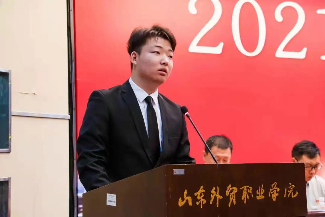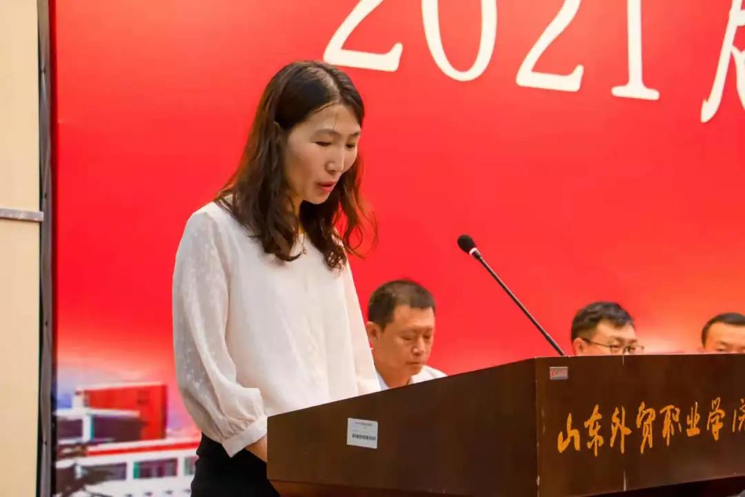 跨境电子商务系教师宗胜春代表教师发言。2001届涉外会计专业毕业生、青岛时代正德财税事务有限公司董事长刘玉洁代表校友发言。信息工程系2021届软件班王宗誉同学代表毕业生发言。