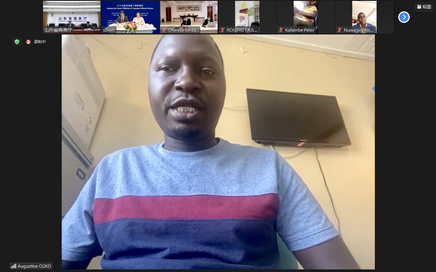 陈会新在致辞中感谢了乌干达全国抵抗运动党一直以来对我国建设中国特色社会主义的支持,2019年中乌磋商建立全面合作伙伴关系,在此基础上,期待通过此次研修班,中乌双方能在“一带一路”倡议、中国的改革开放、政党建设等方面相互学习,深入交流。