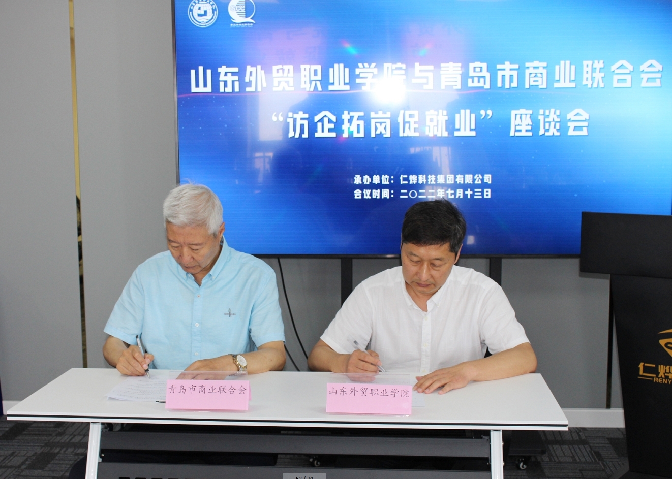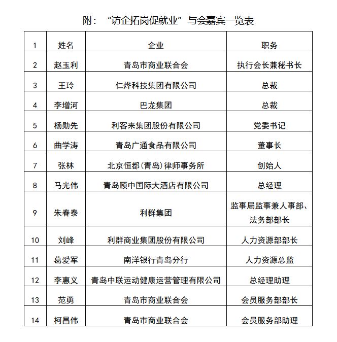 7月13日,学院与青岛市商业联合会“访企拓岗促就业”座谈会在西王大厦仁烨科技集团有限公司举行,青岛市商业联合会执行会长兼秘书长赵玉利,学院党委副书记黄维、财会金融系党总支书记孙茂峰,以及市商联会部分副会长单位、常务理事单位利客来集团股份有限公司党委书记杨勋先、青岛广通食品有限公司董事长曲学涛等10余家企业代表出席座谈会。学院就业导师、仁烨科技集团有限公司总裁王玲主持会议。