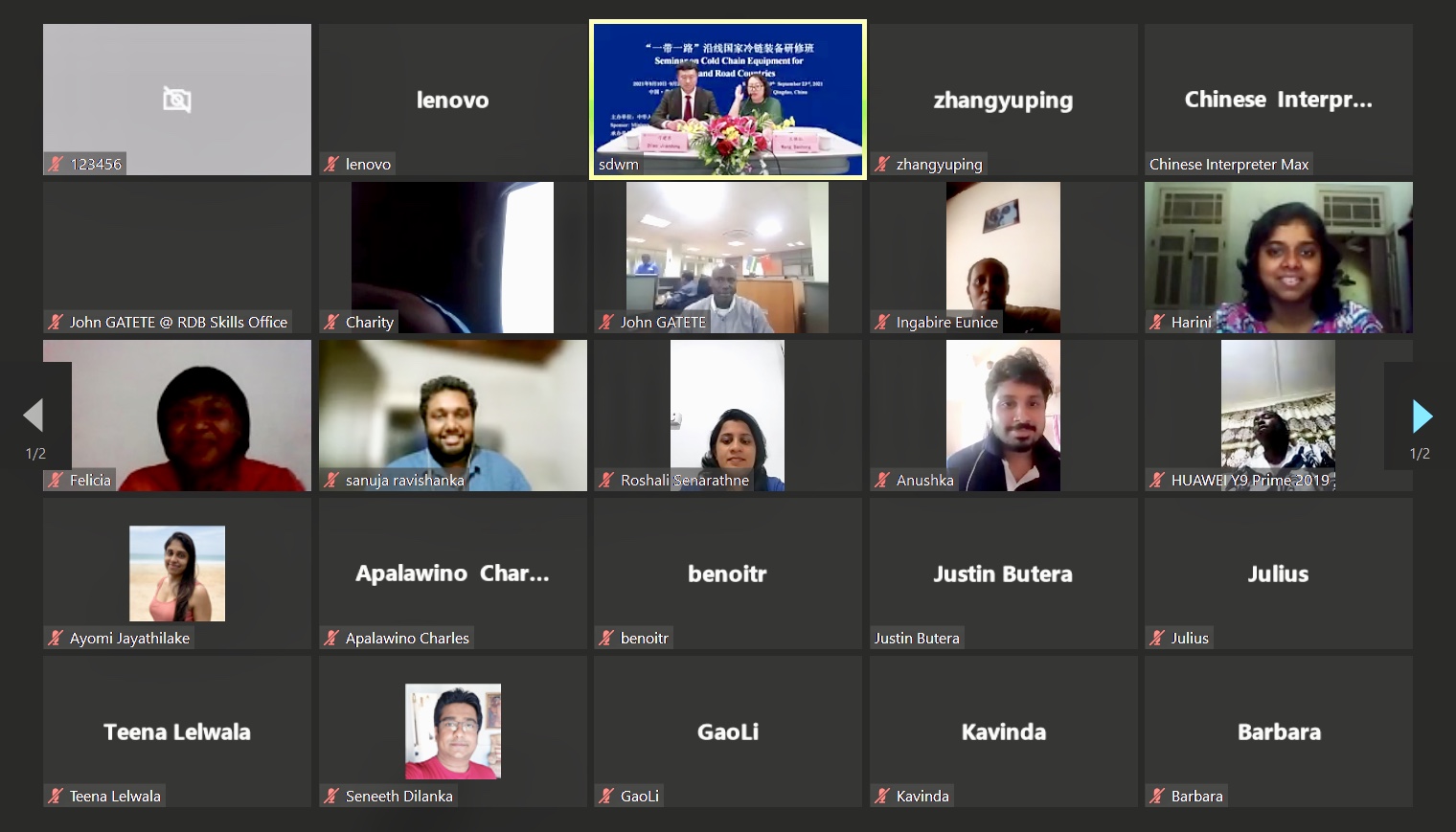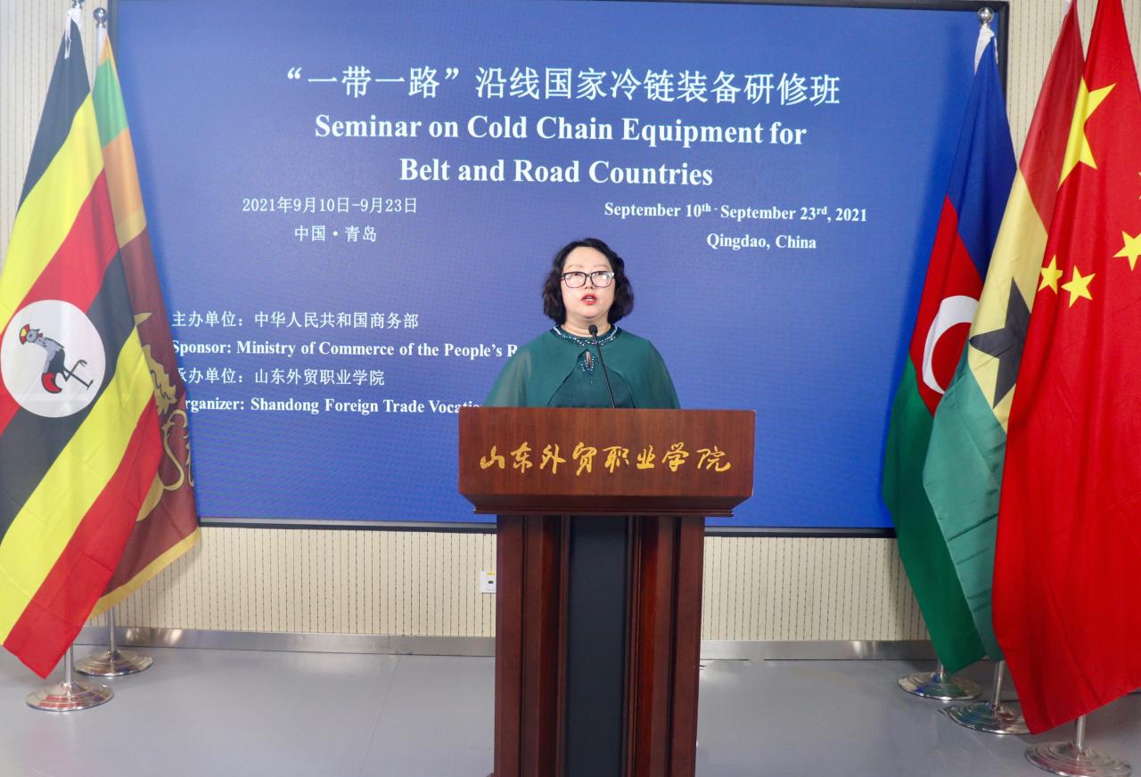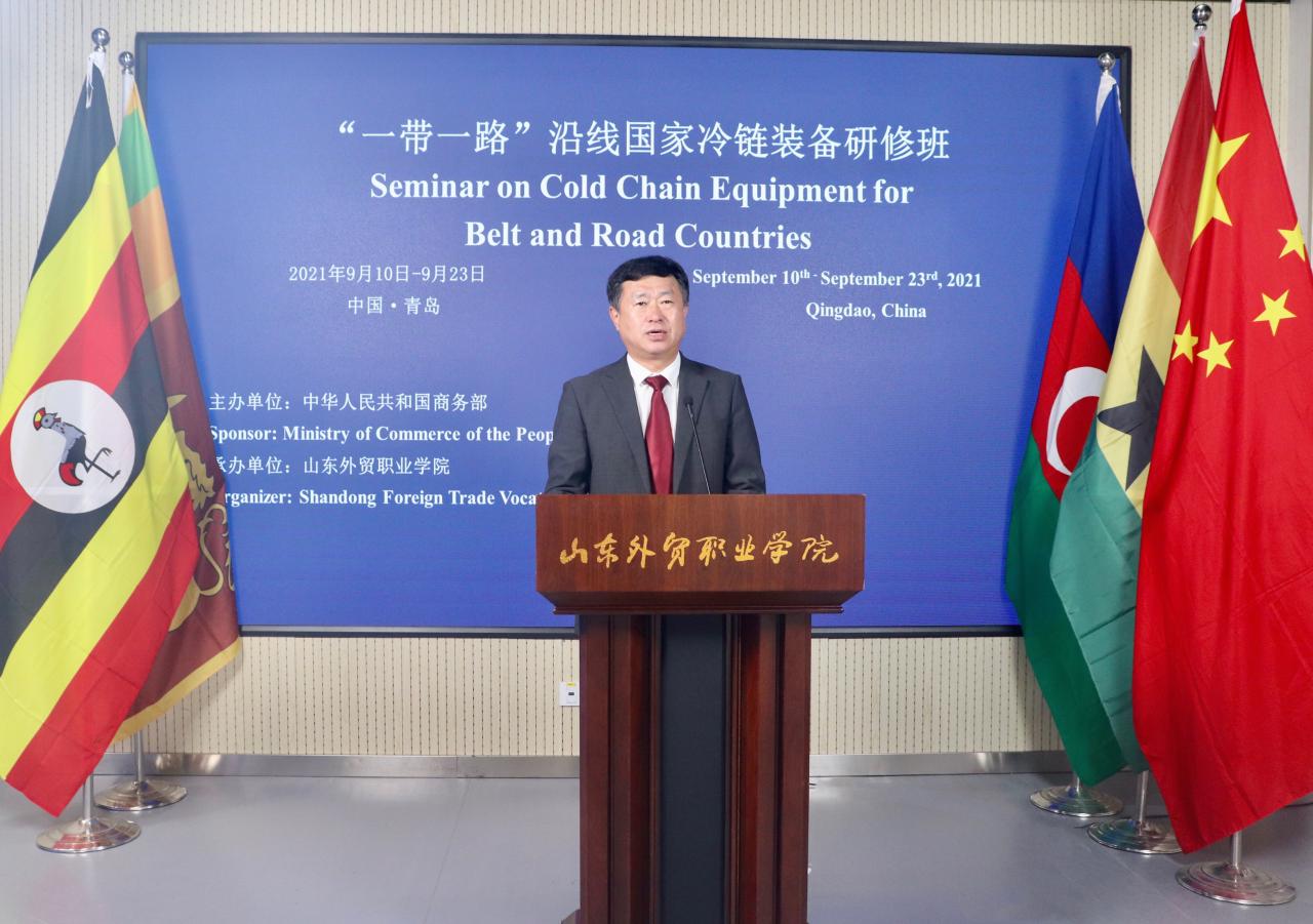 刁建东在致辞中介绍了山东省的基本情况、学院的办学历史、援外培训等情况,重点介绍了中国冷链装备行业发展现状、学院毕业生创办的国际物流运输企业、在国际冷链装备领域的合作情况等。他指出,我国冷链物流基础设施建设一直在加快推进。山东省在冷链物流基础设施建设也有骄人的成绩。截至2021年6月,山东省低温储存规模居各省之首。学院所在的青岛市建设有海港冷链物流中心,实现货品到港,快速检验,保障冷链不断链,有效推动了港口冷链物流的发展。他表示,在研修班举办期间,学院将充分利用各种资源,举办冷链装备企业对接活动,促进山东省与各国开展冷链装备经贸合作,为山东企业“走出去”搭建平台。