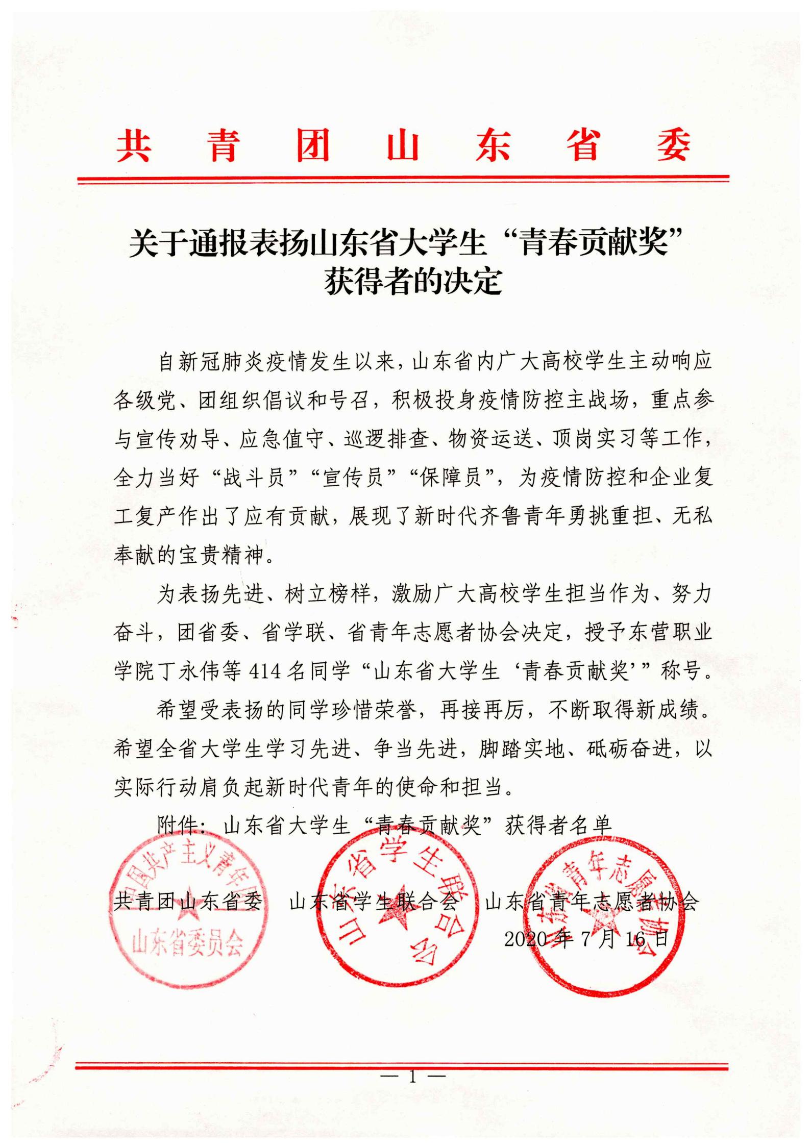 近日,为表彰在抗击新冠肺炎疫情期间有突出表现的大学生,共青团山东省委员会、山东省学生联合会、山东省青年志愿者协会联合向全省414名学生授予“山东省大学生‘青春贡献奖’”荣誉称号,伟德2017级会计1班学生耿银洲光荣上榜。