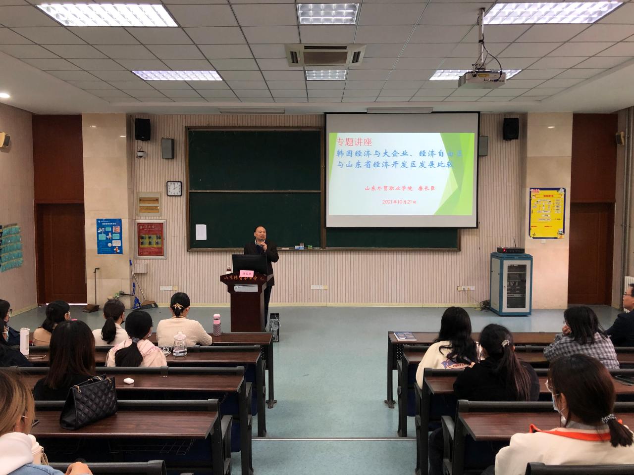 10月21日下午,学院纪委书记唐长臣在2号教学楼A1阶梯教室做了“韩国经济与大企业、经济自由区与山东省经济开发区发展比较”的专题讲座,系党政领导、应用韩语专业师生参加了讲座。
