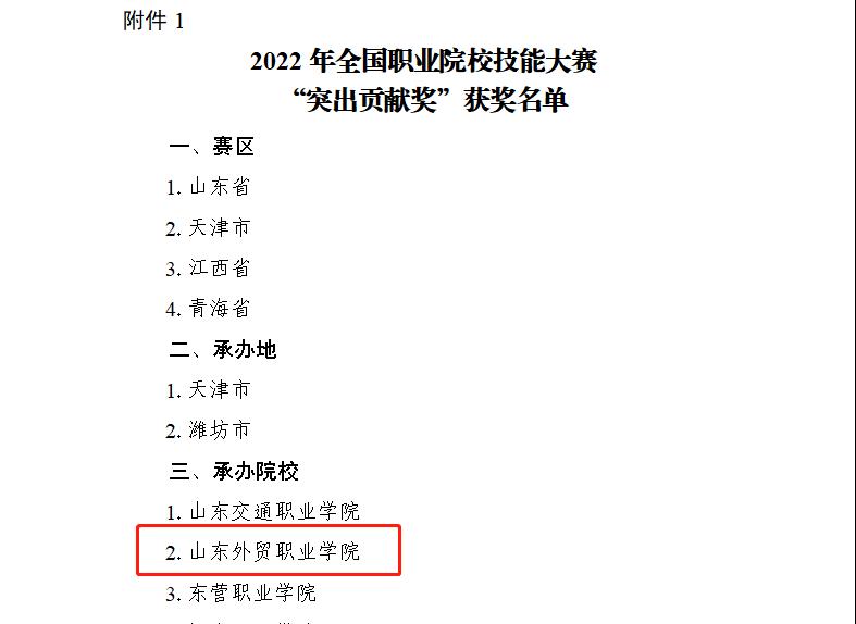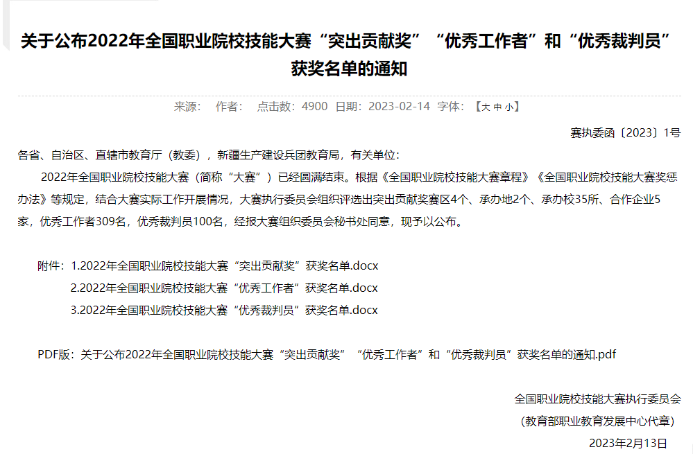 近日,全国职业院校技能大赛执行委员会发布《关于公布2022年全国职业院校技能大赛“突出贡献奖”“优秀工作者”和“优秀裁判员”获奖名单的通知》(赛执委函〔2023〕1号),伟德作为承办院校荣获2022年全国职业院校技能大赛“突出贡献奖”,马文君、徐烨两位老师获“优秀工作者”荣誉称号。