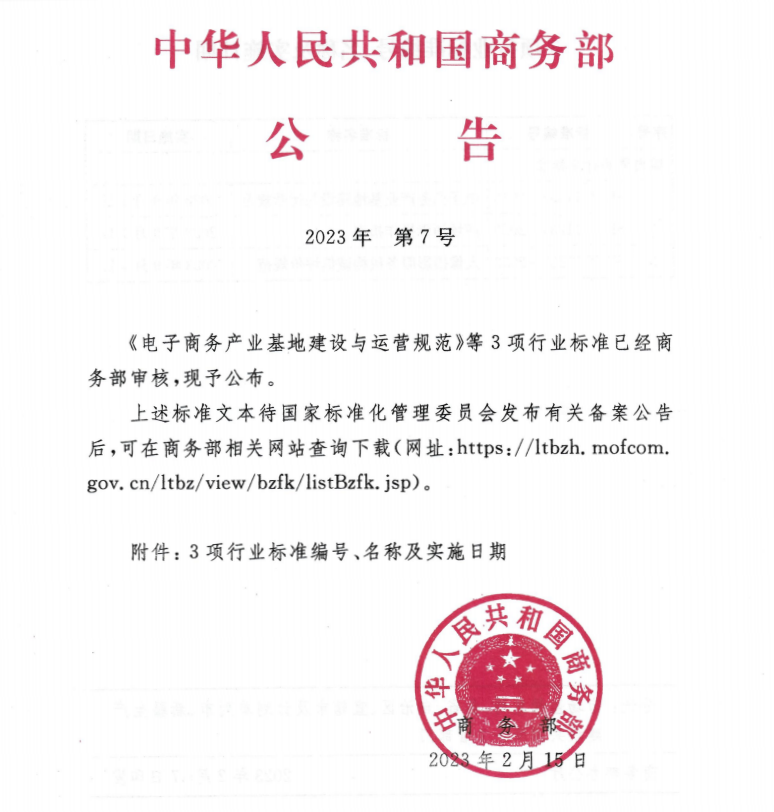 近日,由伟德主笔起草的国家级行业标准——《电子商务产业基地建设与运营规范》(SB/T11233-2023)通过商务部(2023年第7号)审核并公布,于2023年9月1日起在全国范围内实施。