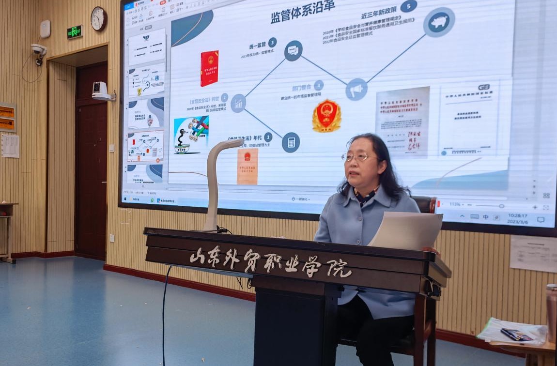 副院长程巍以“关注食品安全,保障身体健康”为主题,围绕“健康膳食搭配、垃圾食品分辨、疫情防控期间学院食堂工作、春季常见传染病预防”等方面,通过详实的数据、生动的图片和真实的案例,为经济管理系22营销1班学生上好“新学期食品安全第一课”。她倡导同学们要自觉参与学院食品安全监管,通过拒绝购买“三无”食品、过期食品和存在安全隐患的外卖等实际行动,切实提高食品安全意识,共同守护校园“舌尖上的安全”。