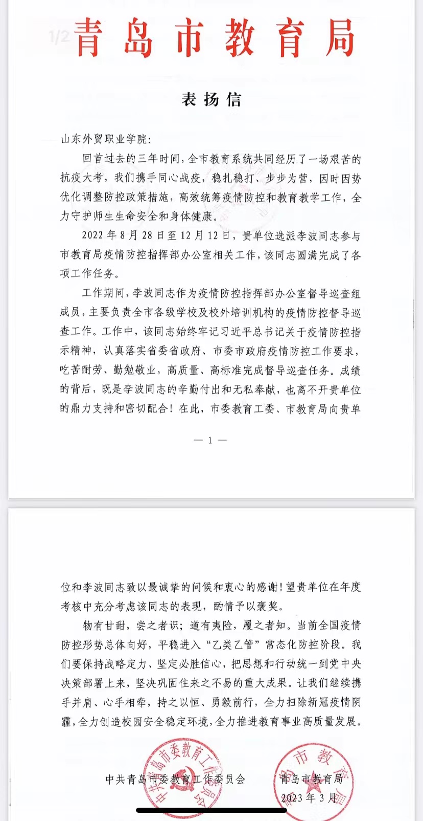 近日,青岛市委教育工委、青岛市教育局向学院发来表扬信,对疫情防控期间作出突出贡献的后勤服务处教师李波给予表扬,并向学院高度的政治使命感和社会责任感致谢。