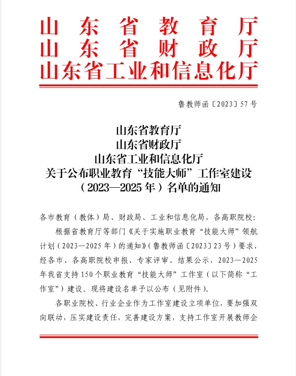 近日,山东省教育厅、山东省财政厅、山东省工业和信息化厅联合印发《关于公布职业教育“技能大师”工作室建设(2023—2025年)名单的通知》(鲁教师函〔2023〕57号),伟德申报的“张海政技能大师工作室”“杜长河技能大师工作室”两个工作室建设项目获批。
