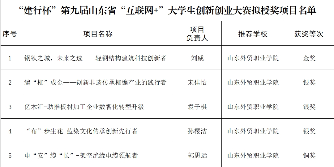 近日,第九届山东省“互联网+”大学生创新创业大赛获奖名单公布,伟德共斩获金奖1项、银奖3项、铜奖1项,实现获奖数量与质量的双突破。其中,“钢铁之城,未来之选——轻钢结构建筑科技创新者”项目获省赛金奖;“编‘柳’成金——创新非遗传承柳编产业的践行者”“亿木汇-助推板材加工企业数智化转型升级”“‘布’步生花-蓝染文化传承创新先行者”获省赛银奖;“电‘安’缆‘长’-架空绝缘电缆领航者”项目获省赛铜奖。