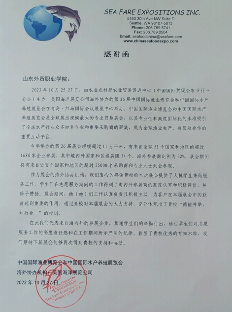 10月25日-27日,由农业农村部农业贸易促进中心主办,美国海洋展览公司海外协助的第26届中国国际渔业博览会和中国国际水产养殖展览会在青岛红岛国际会议展览中心举办,伟德商务外语系48名同学参与此次会展准备和会展服务中,圆满完成了志愿服务工作。