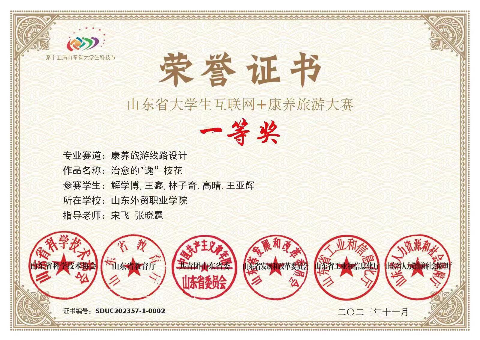 该比赛自5月15日起以在线提交作品的形式启动初赛,10月13日至15日在山东第一医科大学以现场比赛的形式进行决赛,共有来自全省各高校的197支代表队540余名选手进入决赛。伟德旅游管理专业学生解学博、王鑫、林子奇、高晴、王亚辉组成的代表队,经过线路设计、微店铺实操与答辩三个环节的比拼,凭借参赛作品《治愈的“逸”枝花》斩获康养旅游线路设计专业赛道一等奖。